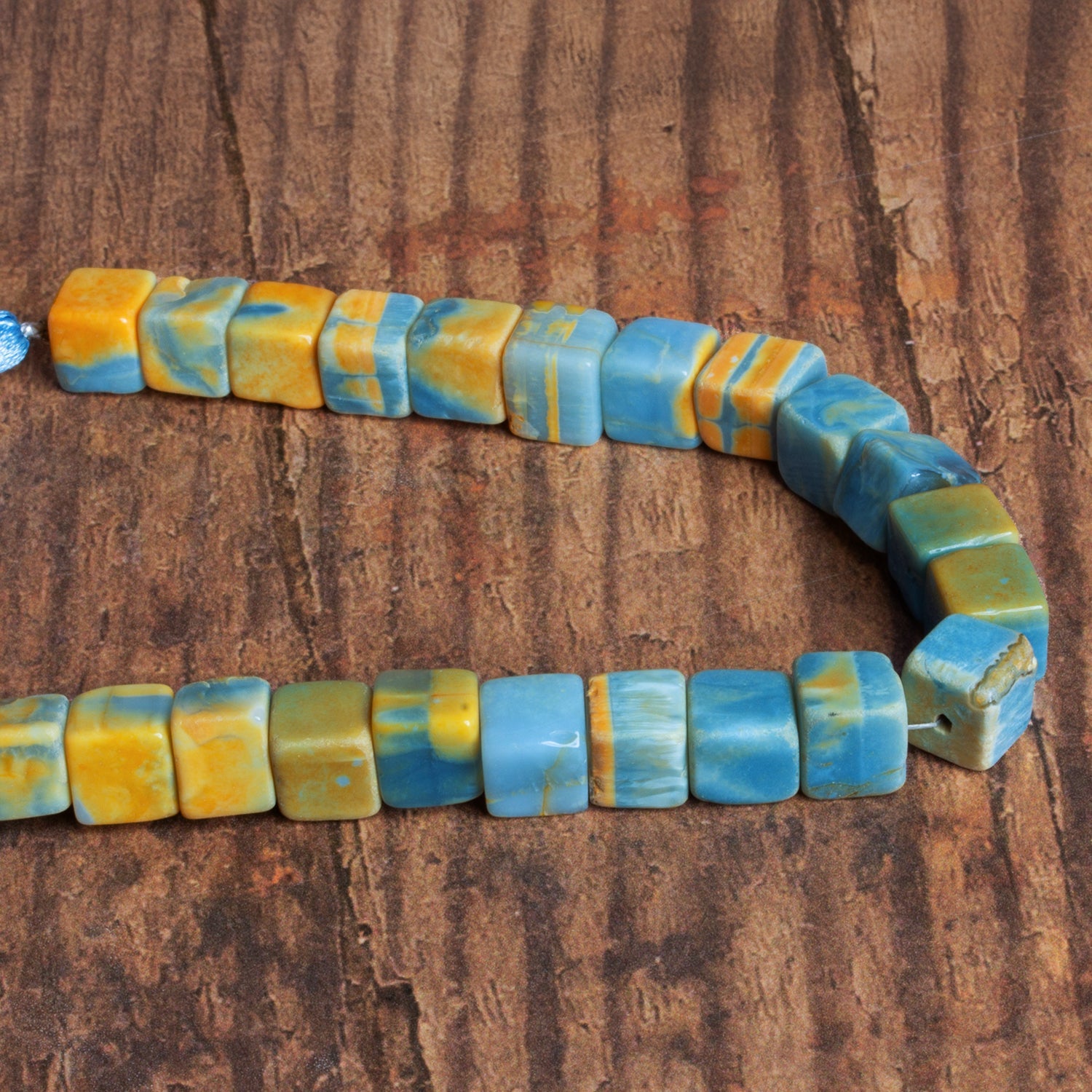 Add bold pops of color to your jewelry designs with these striking Orange & Blue Opal Plain Cube Beads, measuring approximately 9mm to 10mm in diameter. These color enhanced beads are rich in visual texture, blending vivid golden orange with tranquil sky and denim blues in a one-of-a-kind marbled pattern that evokes a painterly landscape.