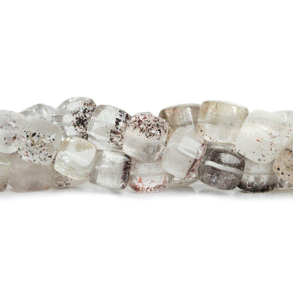 Beads measure about 9mm to 11mm in diameter. These beautiful cubes feature clear bodies filled with colorful inclusions that range from black flakes to colorful sparkles. Expect variation across the strand in size, shape & inclusions.