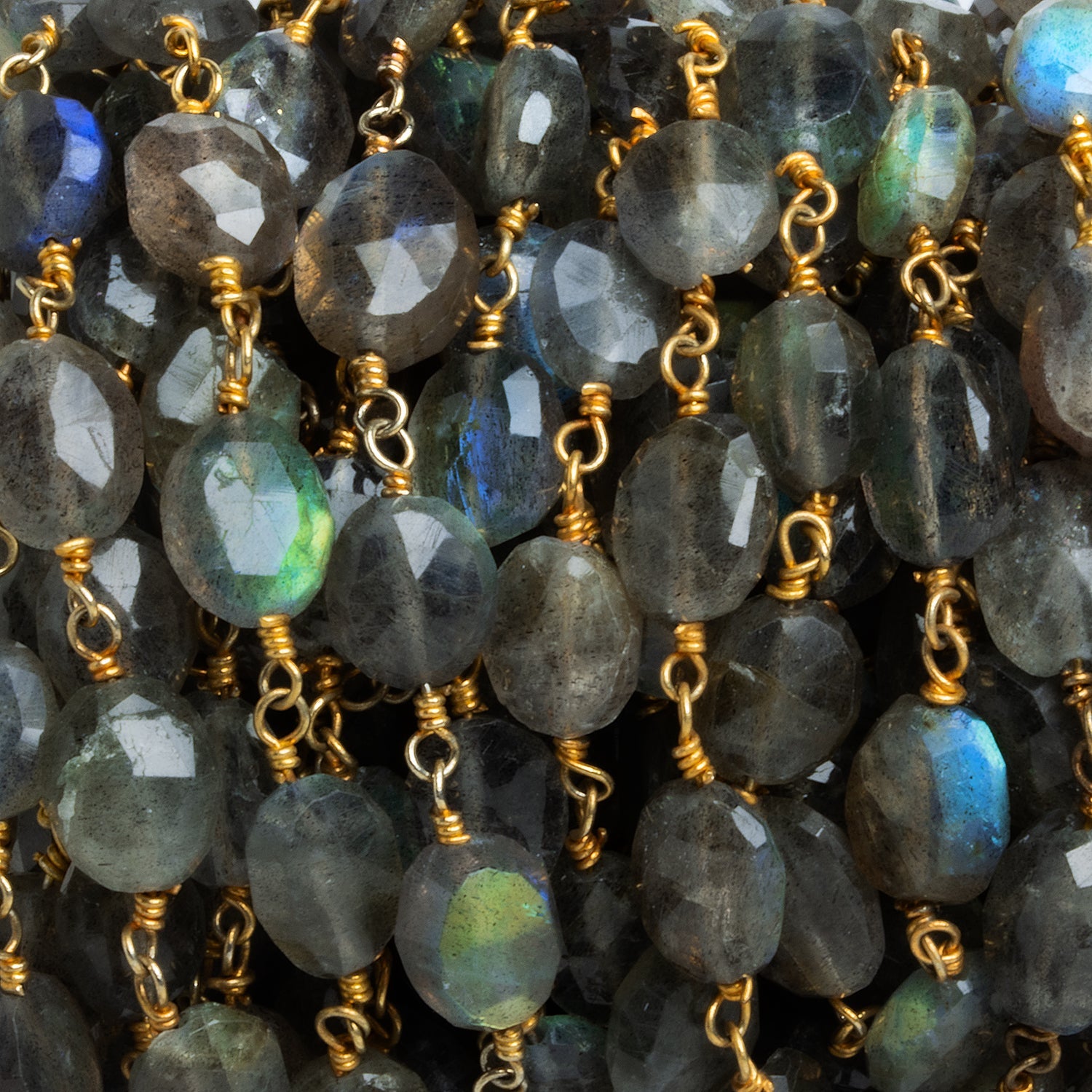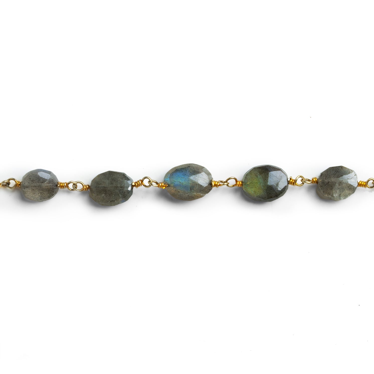 Beads measure about 9x7mm with roughly 22 beads per foot of chain. Experience the wondrous colors of Labradorite with this gorgeous offering that features high-quality Larbadorite paired with our signature Gold plated chain. Flashes of blue and green abound, along with the elegant sheen of 22kt gold makes for an alluring and luxurious piece perfect for a wide range of Jewelry designs. Make an impression in necklaces, earrings, bracelets and more with these sizable, exquisitely crafted opals handwrapped to top-grade chain.