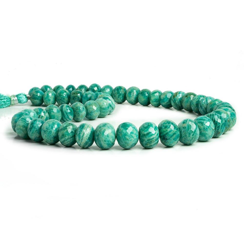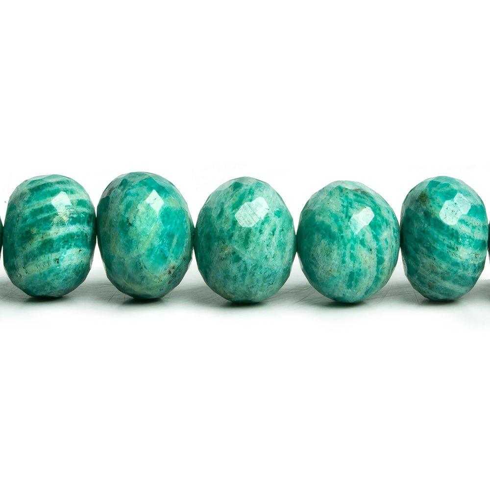 Russian Amazonite faceted rondelles have a vitreous luster with good polish, show good faceting on a symmetrical rondelle shape, the opaque body is a strongly bluish green hue with moderate off white striations. Beads range from 9mm to 13mm in diameter on a graduated strand.