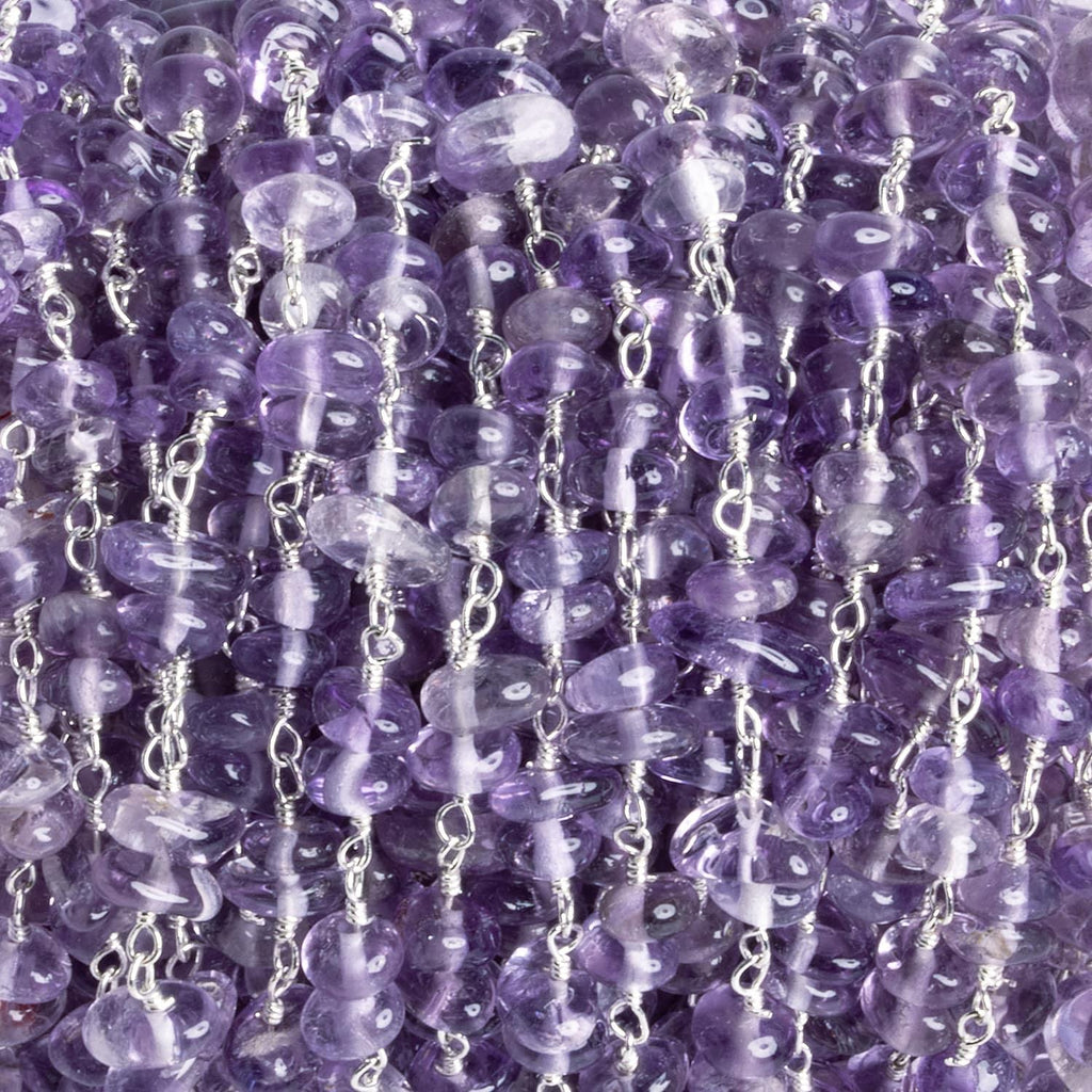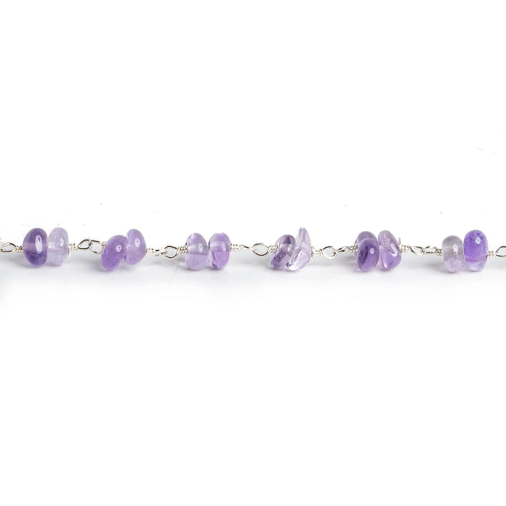 Nuggets average about 7x6mm. These beads showcase translucent bodies with a rich purple coloration. These Amethyst tones look amazing paired with our handwrapped silver plated chain.