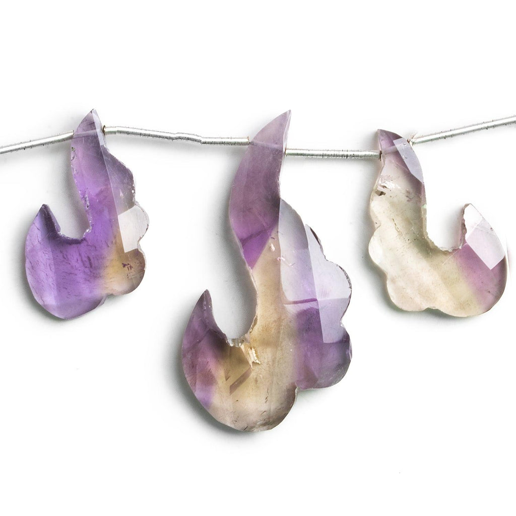 Beads range from about 28x15mm to 43x22mm. These pieces are carved into an intriguing shape and constitute a matched set from the same lightly colored Ametrine material. Fans of carved beads should jump on these top-drilled focal beads!