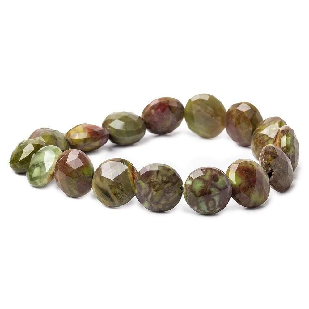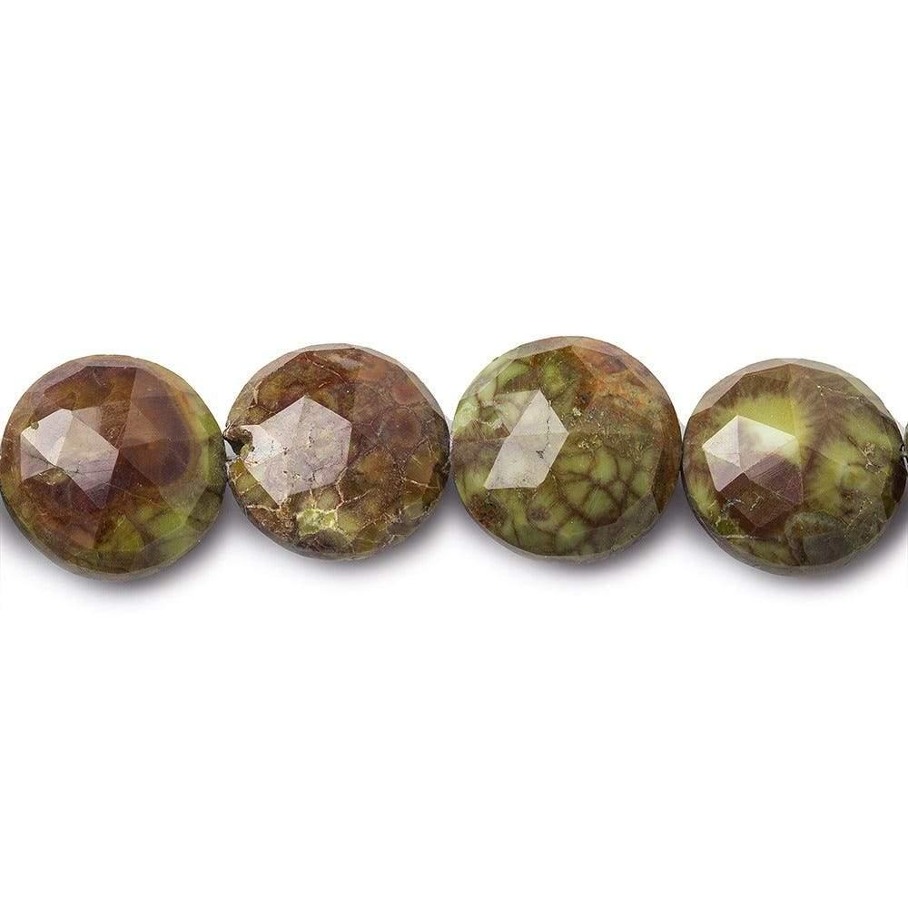 Bamboo Jasper Straight Drill Coins measure approximately 13mm to 15mm diameter, exhibits a waxy luster on a opaque gemstone, the gem bodies are a puffy coin shape with great symmetry, the gemstones are a bamboo leaf green with rich brown veining creating a bamboo forest appearance, the gems are very well matched on the strand for tone and quality. Wonderful group of coins!