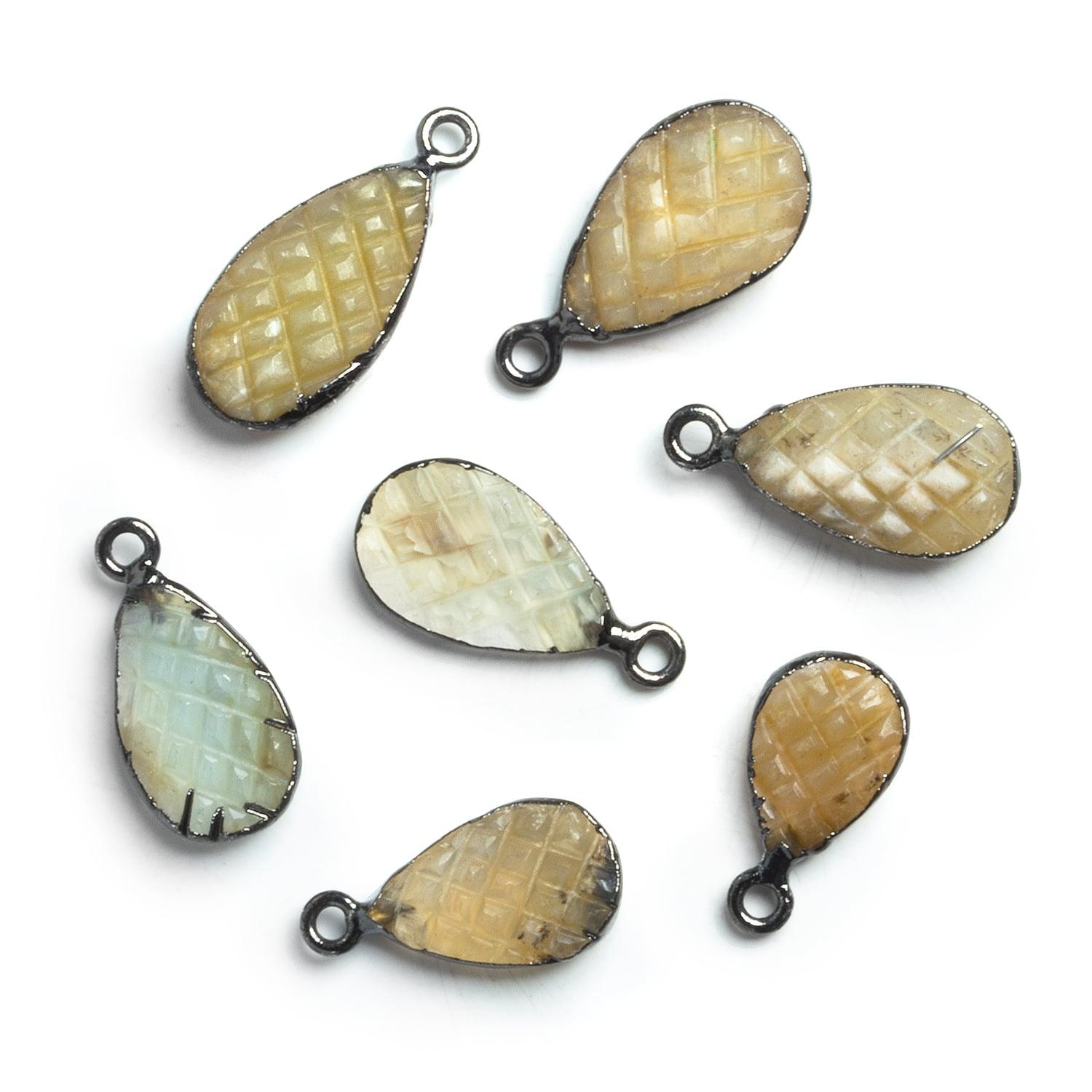 Pendants average about 17x9mm to 26x16mm. These beautiful hand-carved pieces range slightly in size & shape with coloring from reddish yellow to a greenish yellow. Expect cloudy to opaque bodies that look incredible in our black gold leaf. Includes 1 piece.