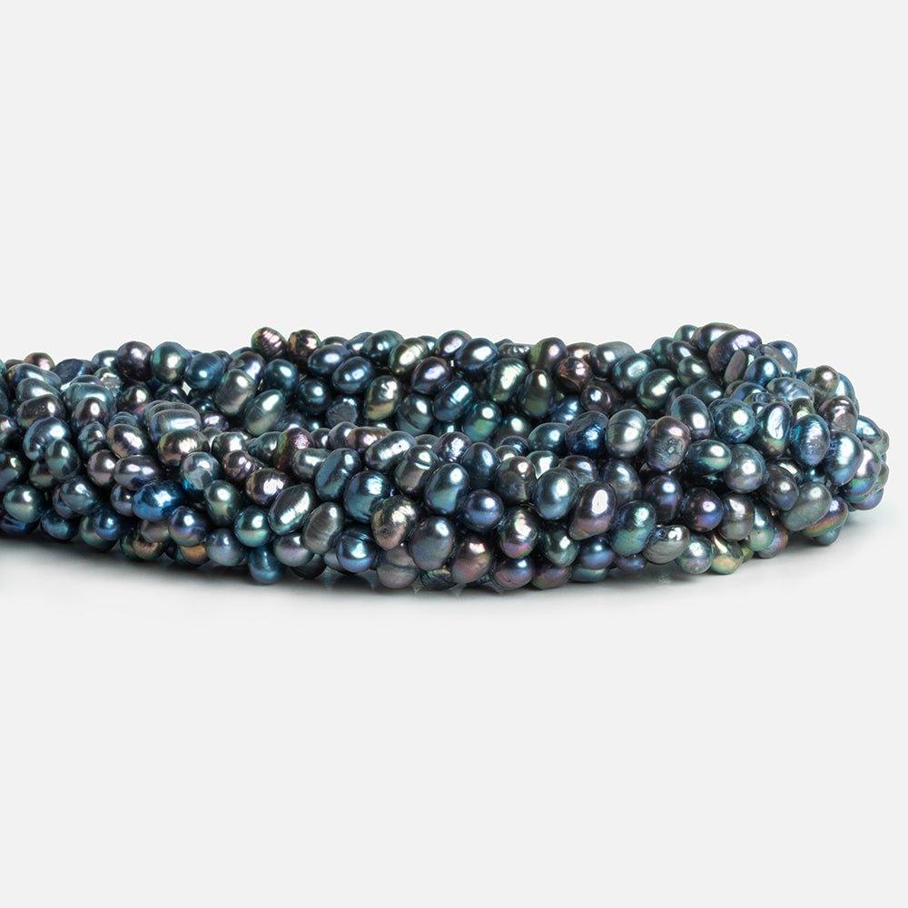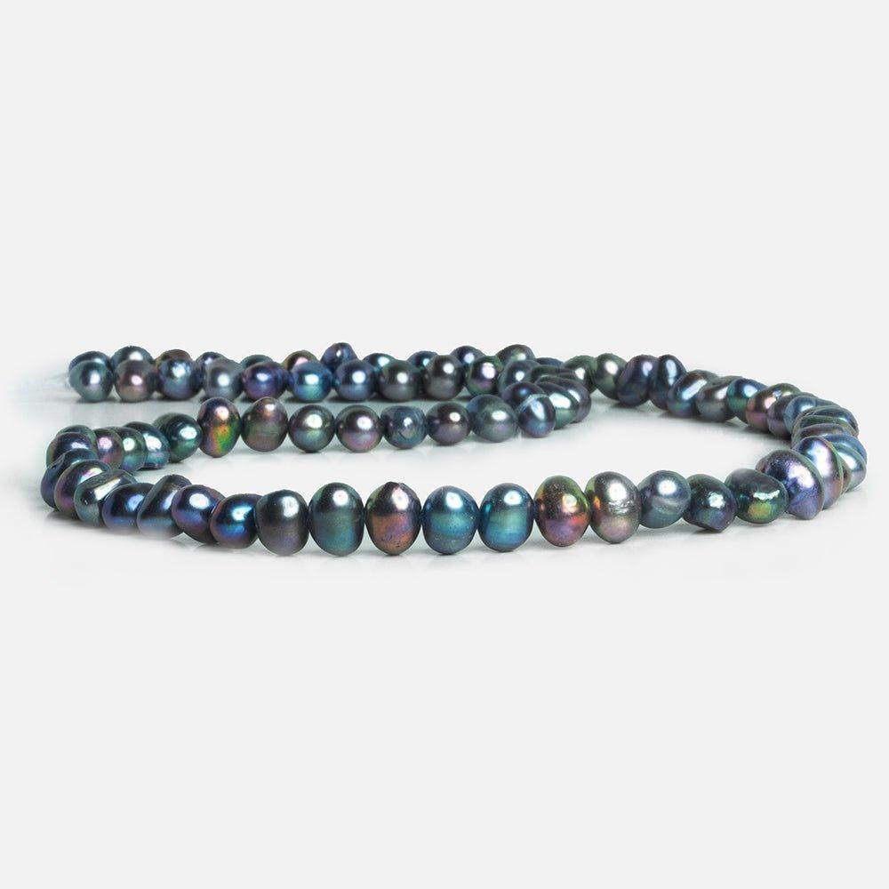Beads average about 8x7mm. These gorgeous baroques show off a richly colored peacock palette full of blue overtones. Expect a side-drilled orientation and moderately light appearance that makes these pieces perfect for a wide range of jewelry designs. Sit down to your next slate of creations with a few strands of our classic baroque pearls at hand!