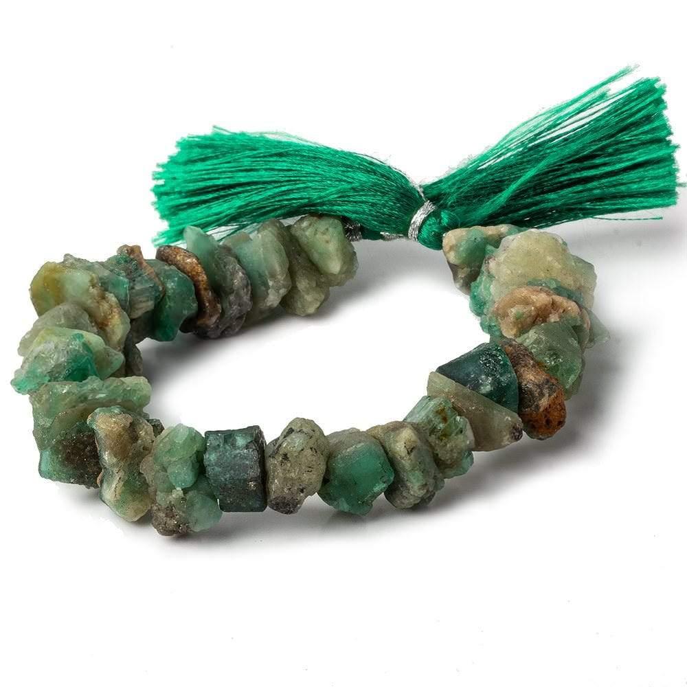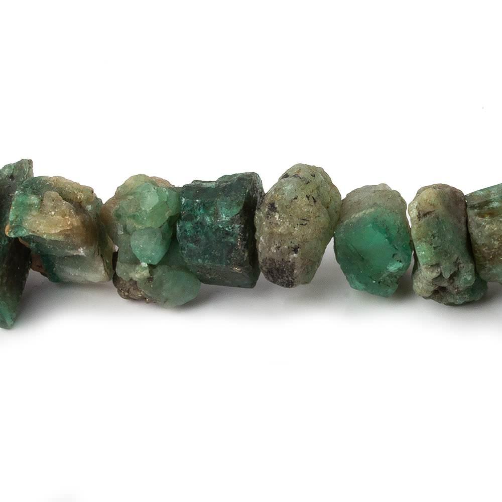 Emerald chip faceted natural crystals are center drilled, show a dull to vitreous luster, have been center drilled, have irregular crystal shapes, the beads are a light green to dark green with varied tonal quality, and strands have varied measures of approxiately 9x8-12x6mm with varied thickness.