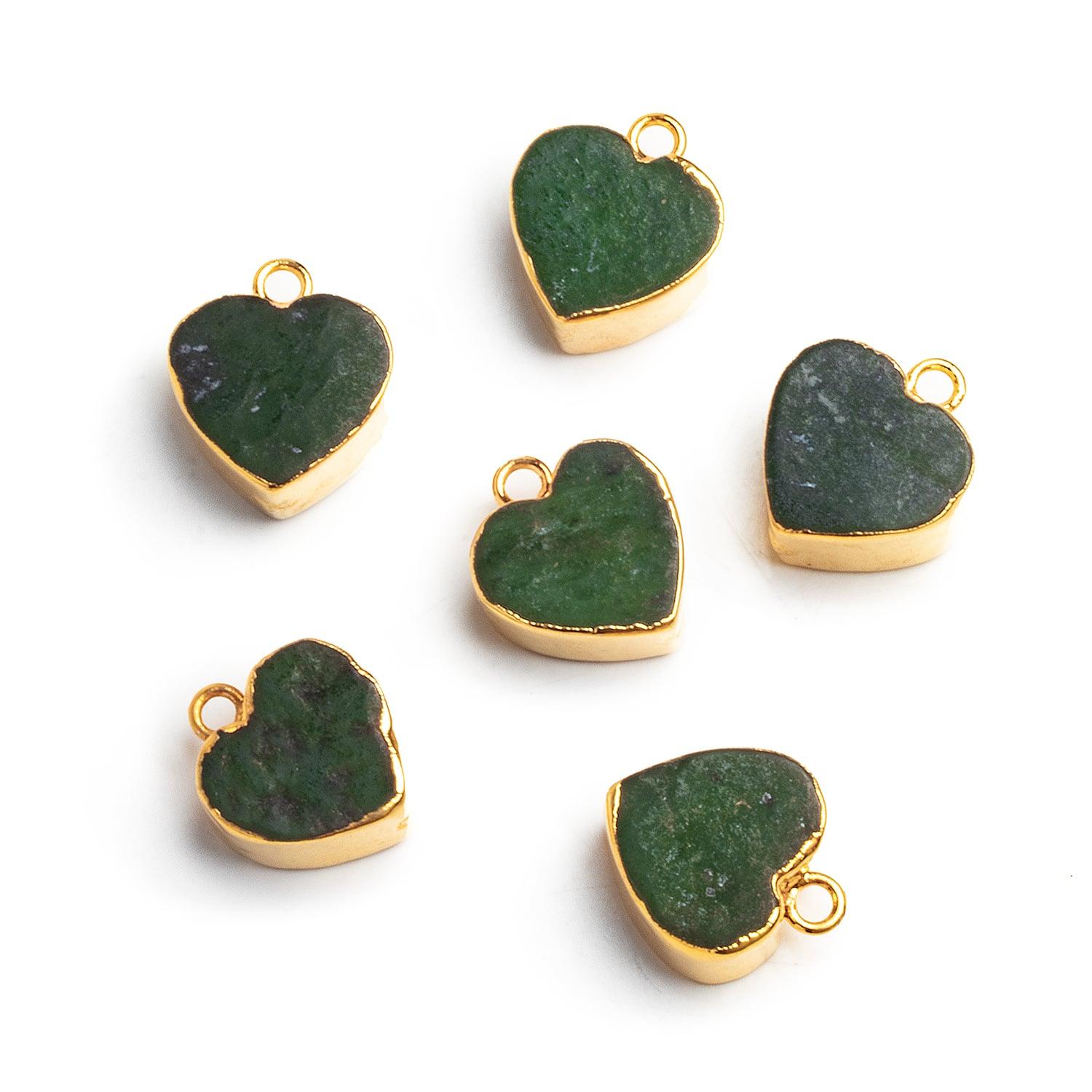 This pendant piece features beads that are 16mm in diameter and rise 8mm from a flat face. The beads are precisely shaped and surrounded by our signature gold leaf. The jade used is natural nephrite and has a rich olive color.