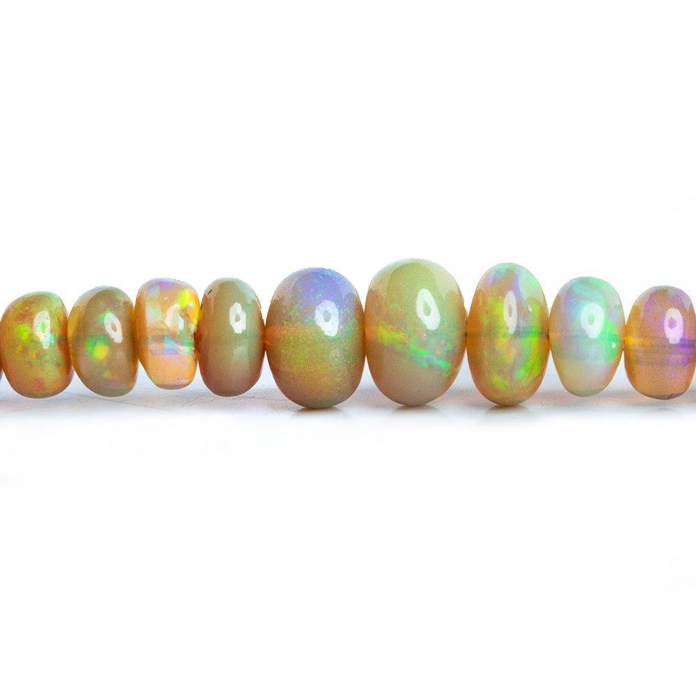 Beads range from 5mm to 9mm in diameter. These Ethiopian Opal beads have very strong & bright Play of Color in red orange-lime green-orange-yellow with a matched, medium dark golden hued body. These fiery, translucent, jelly Opal gems are AAA Grade!
