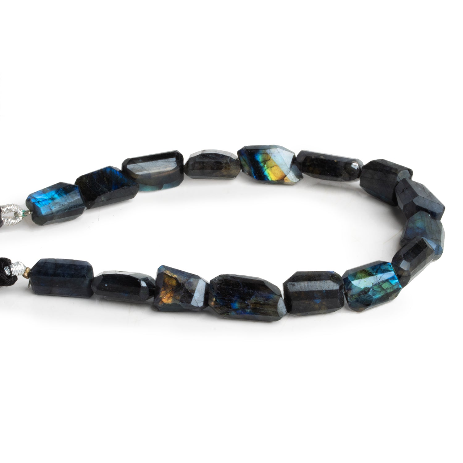The faceted nugget beads measure 15x10x8mm and have been color treated to enhance their labradorescence, resulting in stunning flashes of color. These beautiful beads exhibit exceptional flash on their flat surfaces, showcasing an array of hues, from yellow to deep blues.