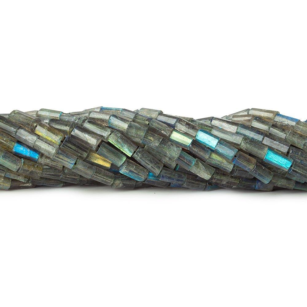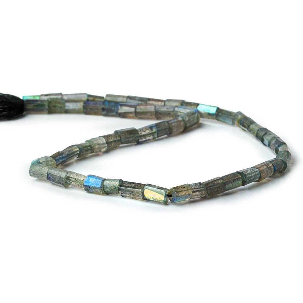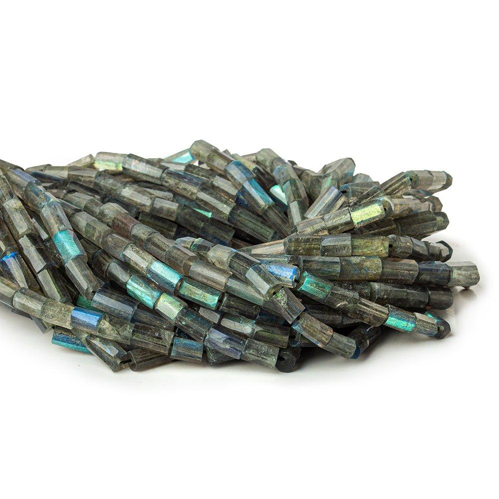 Labradorite faceted tubes 13.5 inch strand 48 beads with measures of 6x7mm up to 9x6mm approximate size. As these are hand cut and hand faceted, bead height is varied on the same strand.