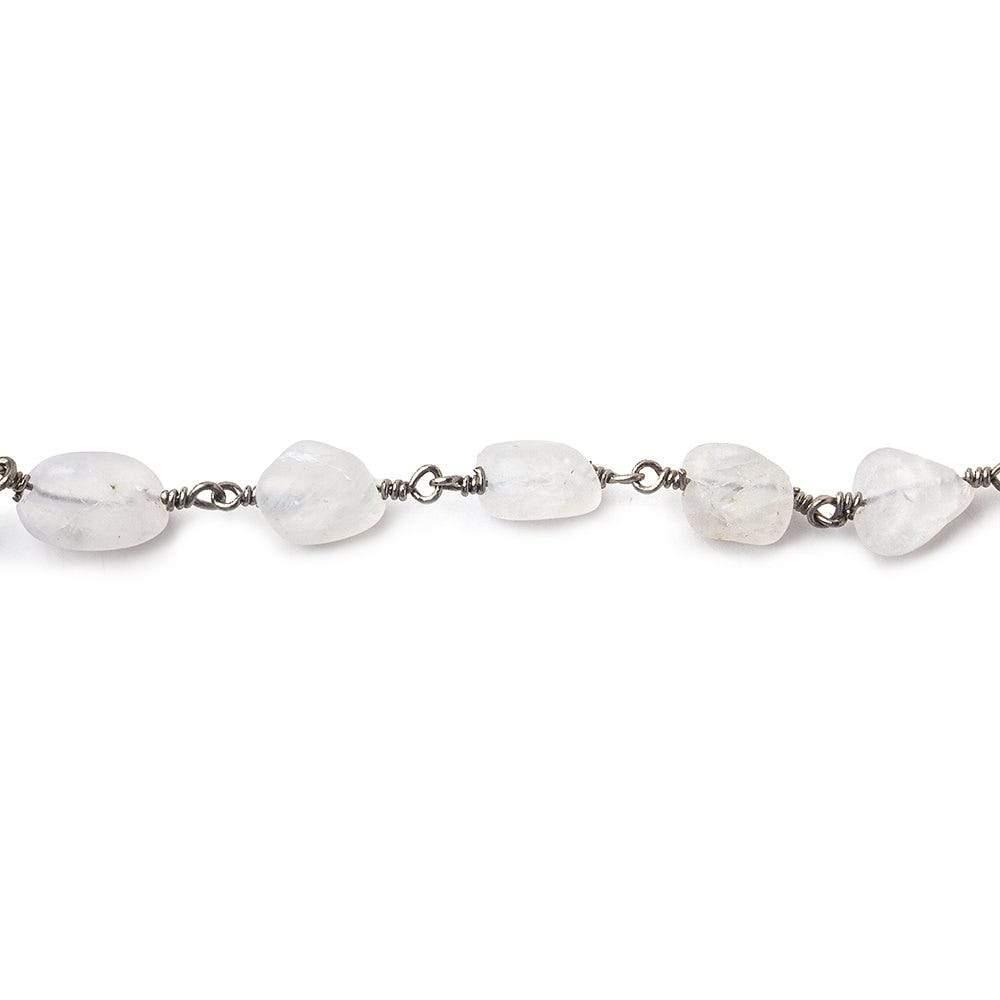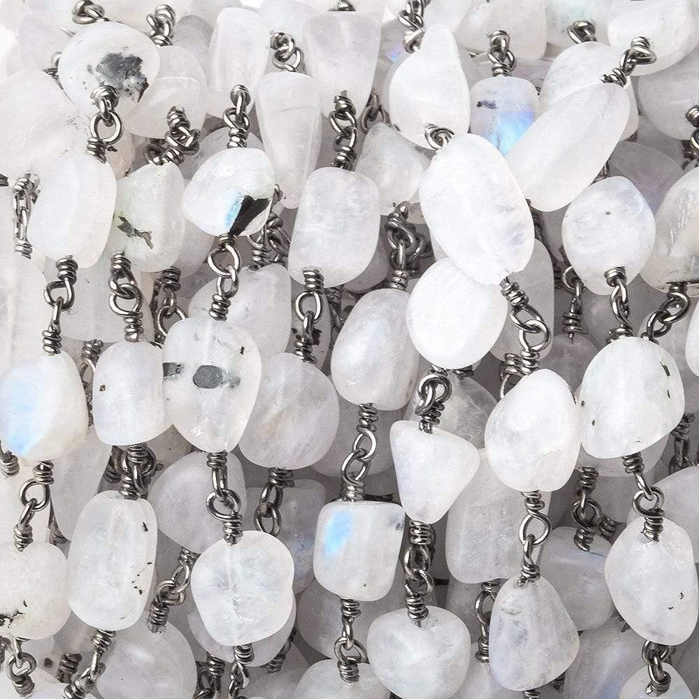 7x7mm up to 13x7mm Matte Rainbow Moonstone nugget Black Gold plated hand wire wrapped Chain sold by the foot having 21 beads per 12 inch increment. Order 3 quantity to receive 3 feet total length.