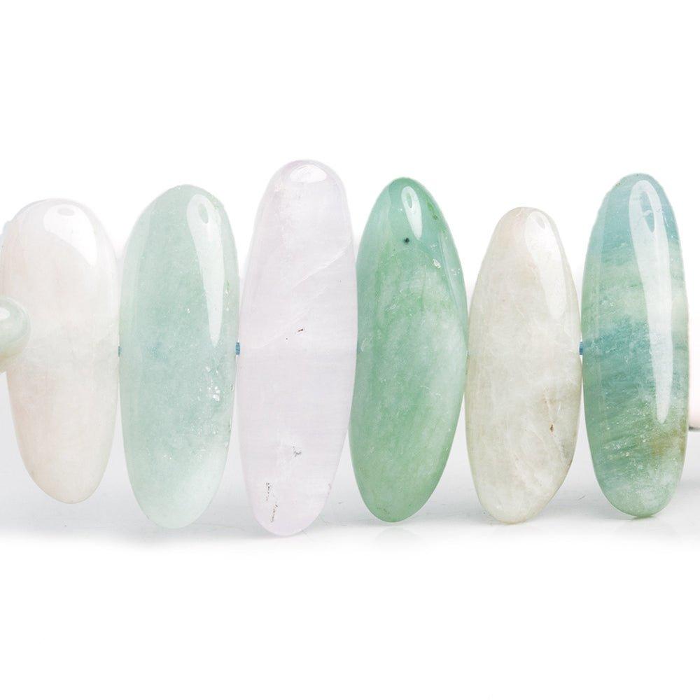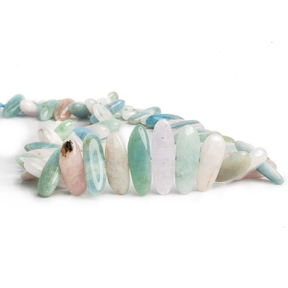 These beads range from 12x7mm to 24x8mm. These long, thin & smooth nuggets showcase the natural color palette of beryl from Aquamarine and Green Beryl to Morganite.