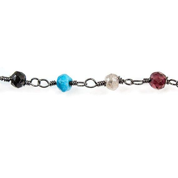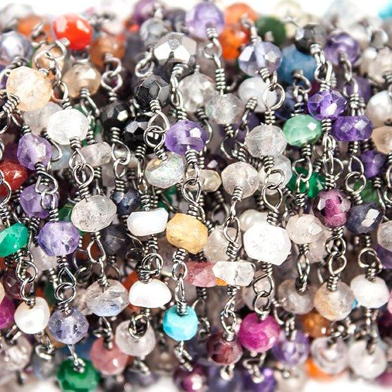 Multi Gemstone faceted rondelle Black Gold plated Rosary Chain by the foot is an approximate 3mm to 3.5mm diameter measuring 39 pieces per 12 inch length. 3 quantity = 3 feet continious length
