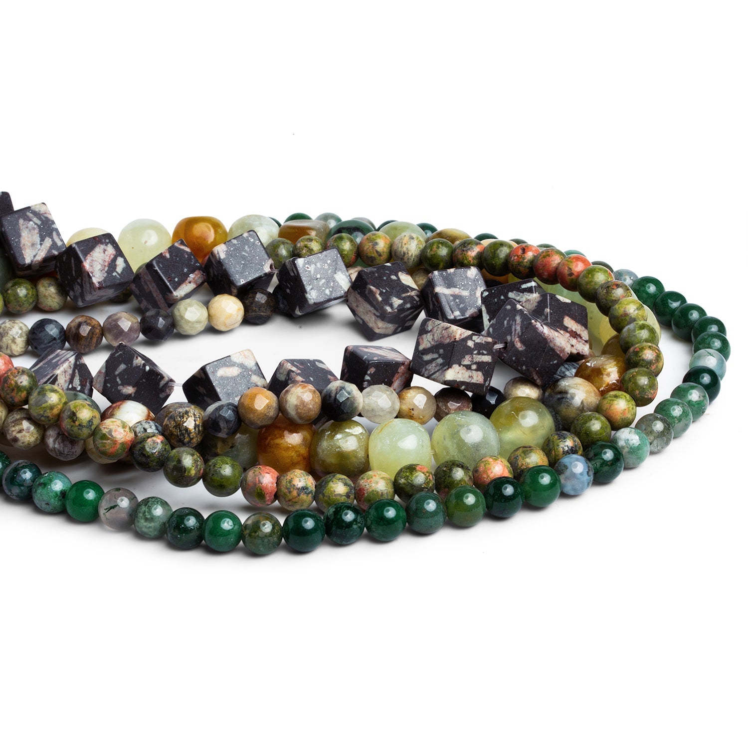 Includes the five strands seen here ranging from about 6mm to 11mm in diameter. The beads have a 1mm large drill hole.