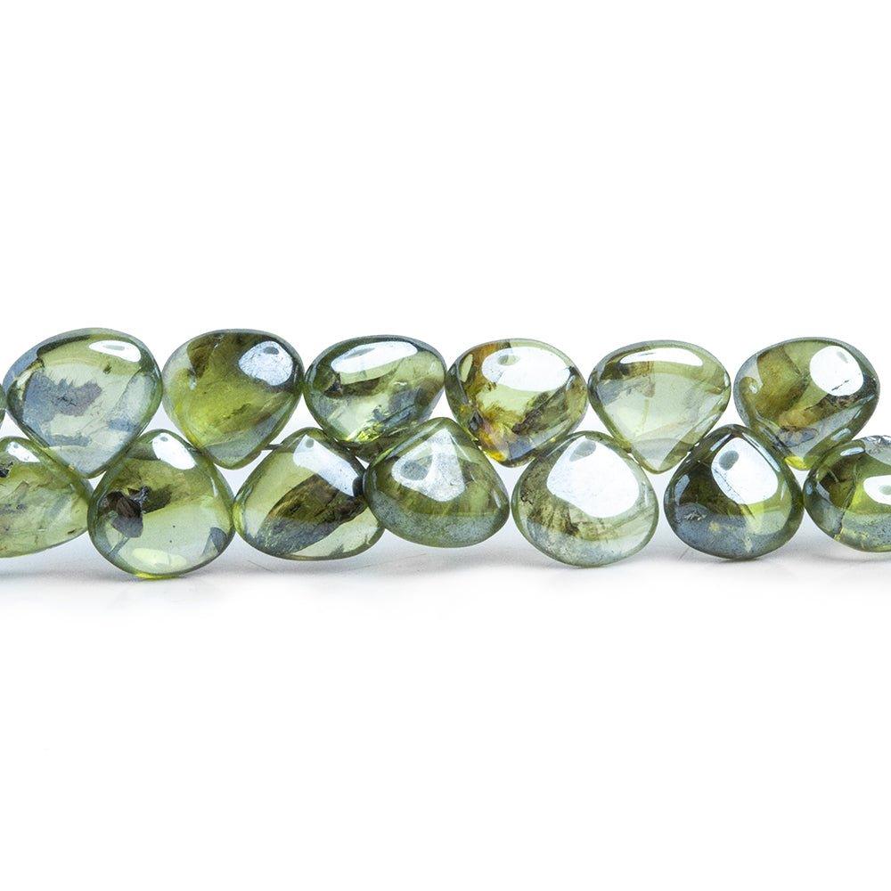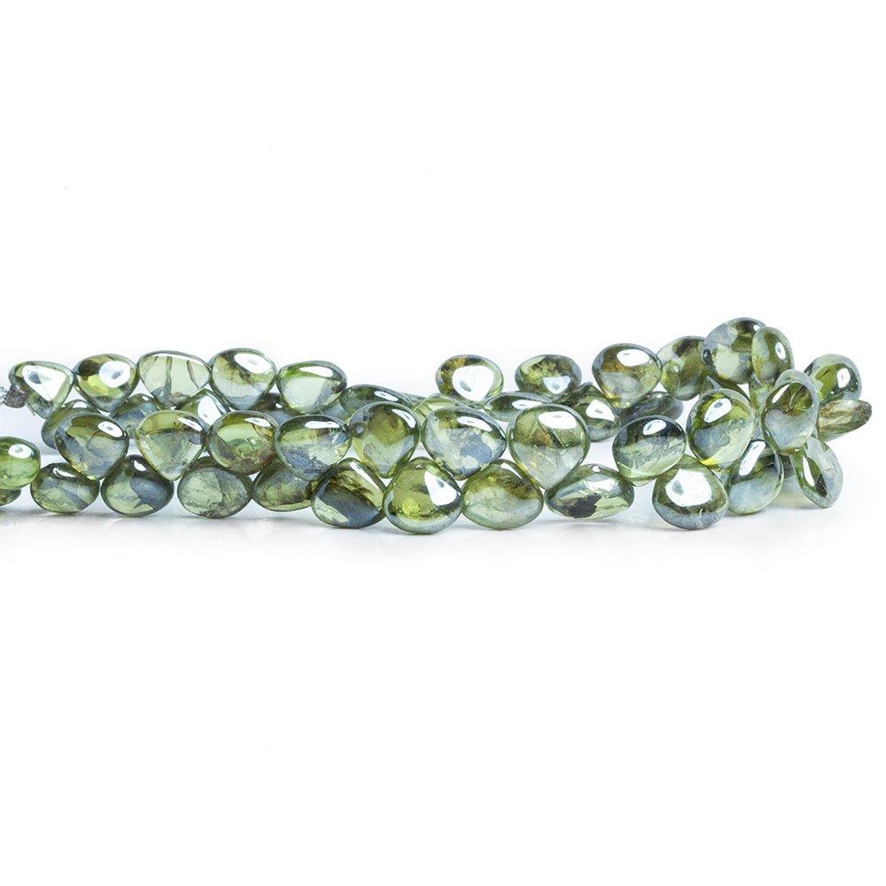 Mystic coated Prehnite plain heart beads have a metallic luster on the translucent gemstones showing high brilliance and symmetrical shape for the well matched strand of rich saturated lime green beads. Beads average 4-6mm on a slightly graduated strand.