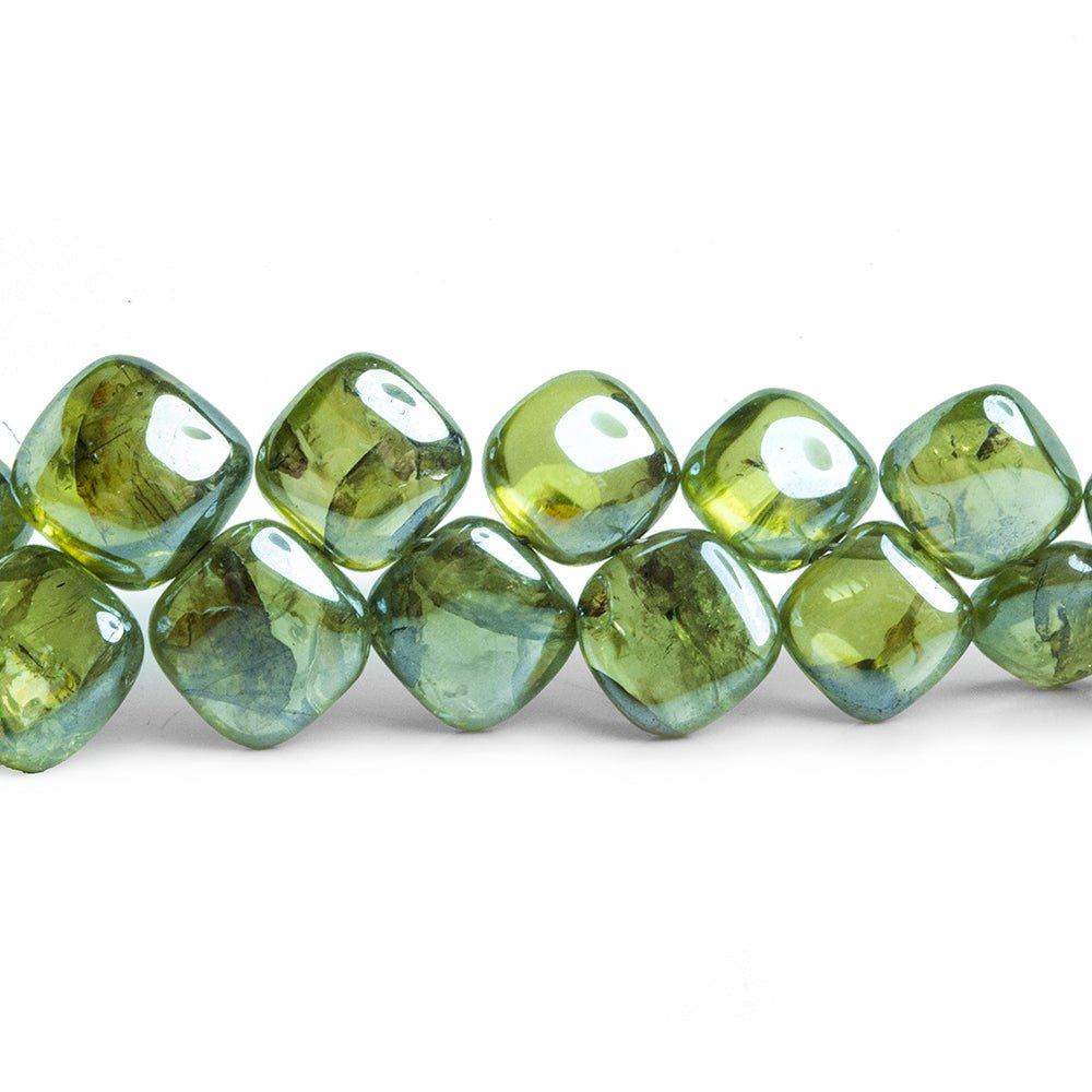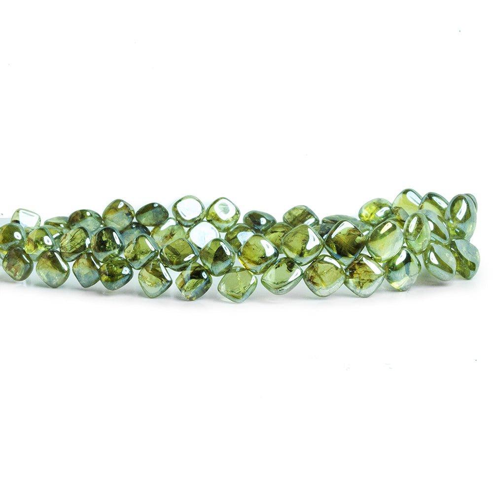 Mystic coated Prehnite plain pillow beads have a metallic luster on the translucent gemstones showing high brilliance and symmetrical shape for the well matched strand of rich saturated lime green beads. Beads average about 5x8mm on a graduated strand in diameter.