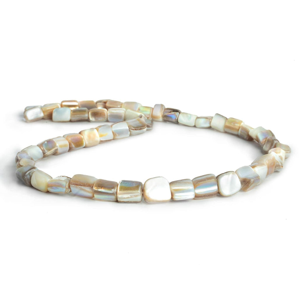Beads average about 8x6mm to 10x9mm. These beautiful, irregular rectangles shine with a colorful flash beloved in fans of shell beads. Expect a subdued beige base color with bright whites & vibrant colorplay across the strand.