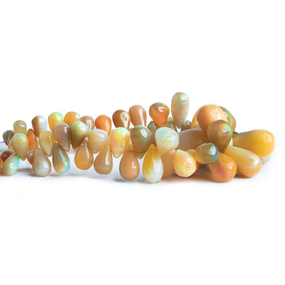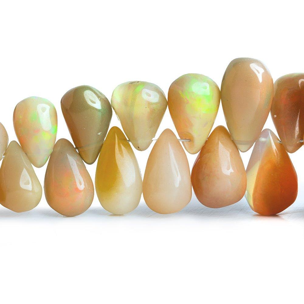 Beads range from 6x3mm to 20x12mm on a graduated strand. This unique offering shows off the colorful flash beloved by fans of Ethiopian Opal on beads with peachy undertones. Their plain teardrop shape has naturalistic qualities that promote versatility in their usage, making them perfect for necklaces and earrings of all kinds.