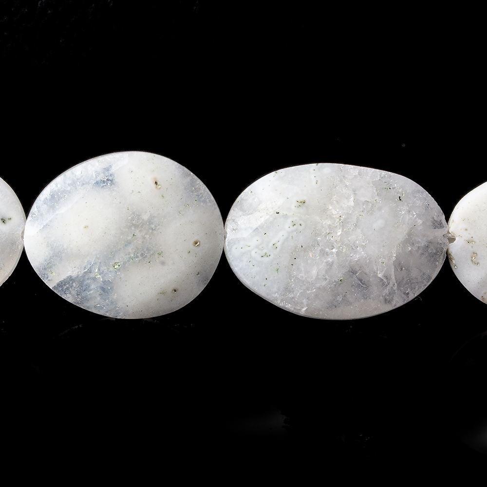 Peacock Solar Quartz Straight Drill Ovals measure approximately 15x12x5mm up to 23x18x5mm in size, the gems have a vitreous luster, the gems are well polished with pitting due to the internal features reaching the surface, these Solar Quartz beads have good faceting creating a fairly symmetrical oval shape, the body colors are a crystal quartz and a milky quartz transparent to a mostly semi-translucent quality, these gems show areas that resemble `crackled ice` and show darker green and brown Peacock hued features sprinkled throughout the strand for a well matched group of Peacock Solar Quartz gems.