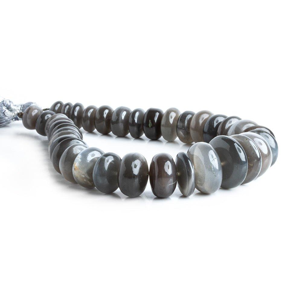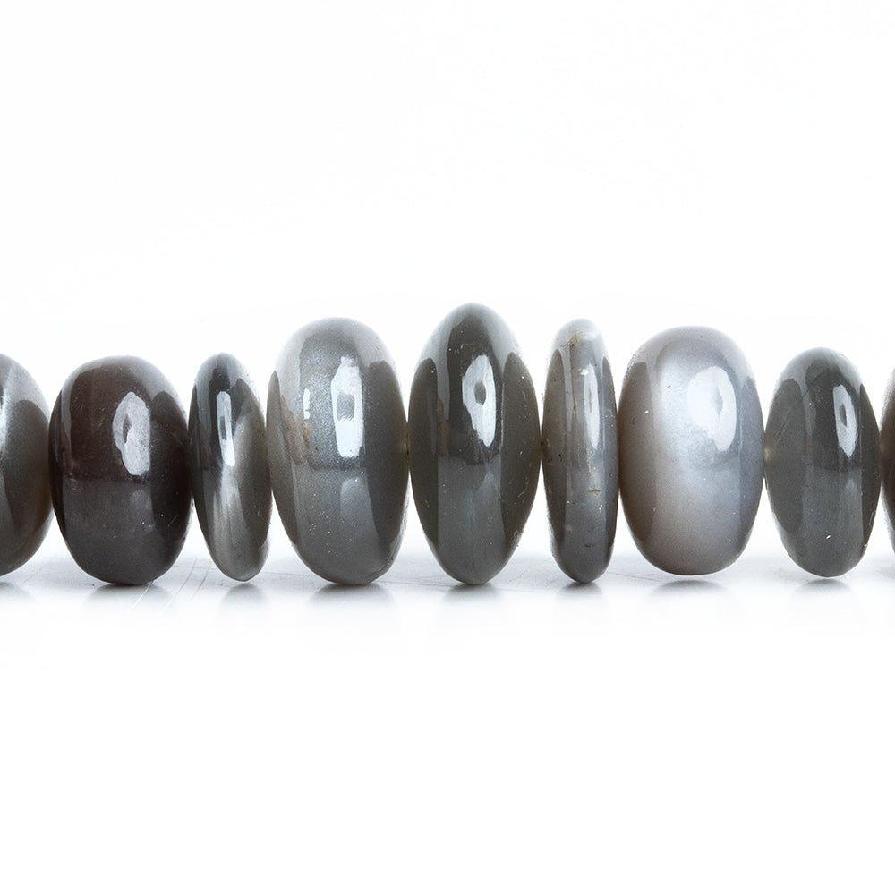 The beads in this strand are 8-9mm in diameter and have a smooth, graduated design. The Platinum Grey Moonstone Plain Rondelles measure approximately 8-9mm in diameter and have a shiny, glass-like appearance. They boast excellent shape symmetry and a high polish, showcasing a beautiful semi-transparent body color with a range of platinum grey hues. Throughout the strand, the beads display a stunning ethereal milky adularescence and appear as brilliant mink colored gems, adding to the overall beauty of this piece.