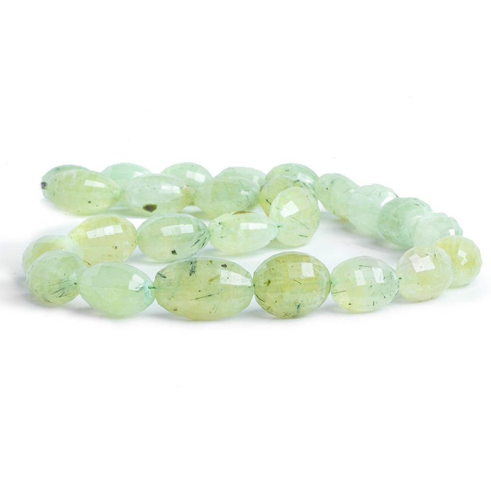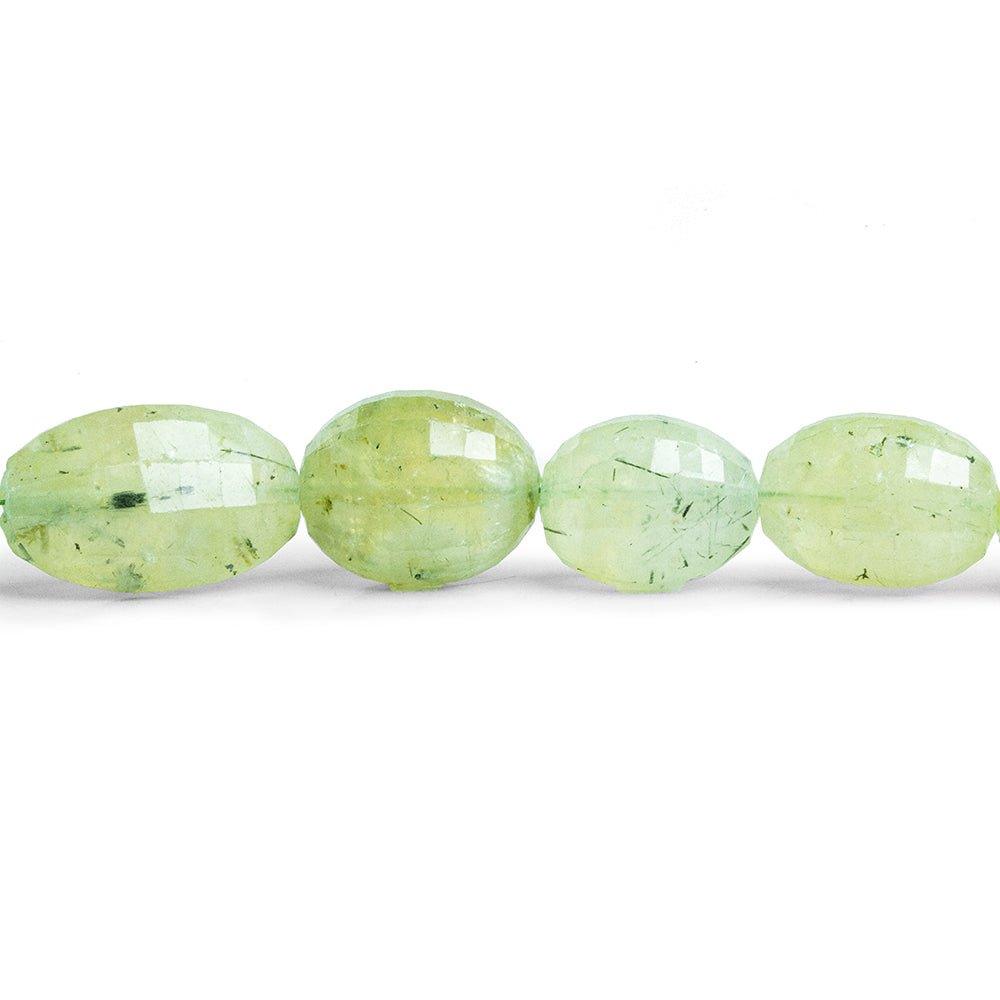 These Prehnite Faceted Oval Beads measure 11x9mm to 14x10mm and have a glass-like luster. With a symmetrical shape, good polish, and a light minty green hue, the transparent beads feature visible internal characteristics for a soft glow. They are also matched for quality and provide a unique touch to any jewelry piece.