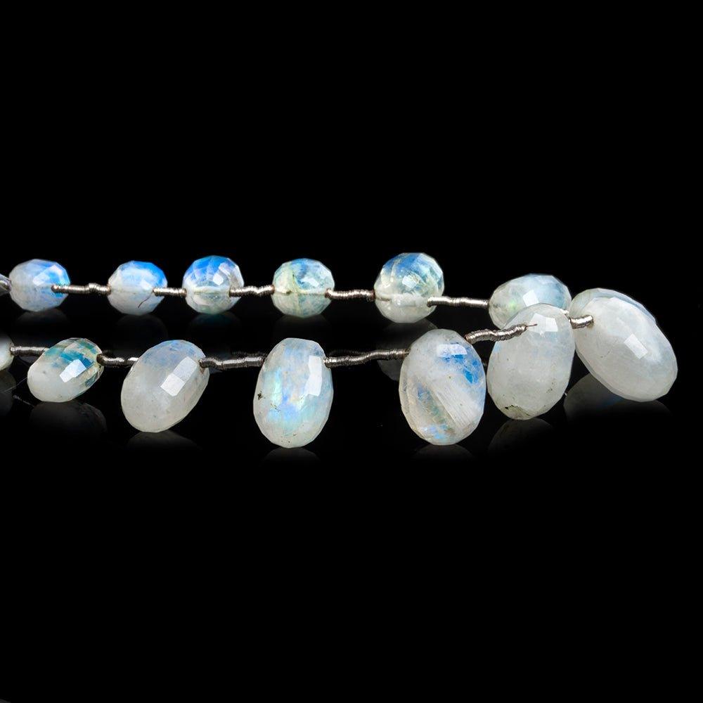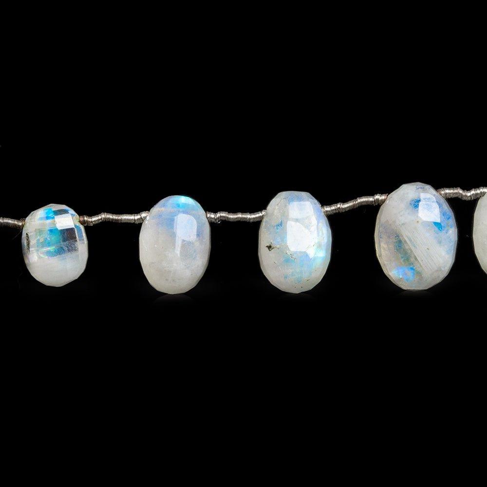 Rainbow Moonstone Top Drilled Faceted Ovals measure approximately 10x7mm up to 14x11mm in size, beads have a vitreous luster, show blue-green-yellow-purple labradorescense in the milky white & semi-transparent body, shapes are asymmetrical and full bodied, gemstones are well matched for tone and hue on strand with varied quality, facets and polish are of good make, and these Rainbow Moonstones present with moderate internal characteristics within these flashy rainbow moonstone beads.