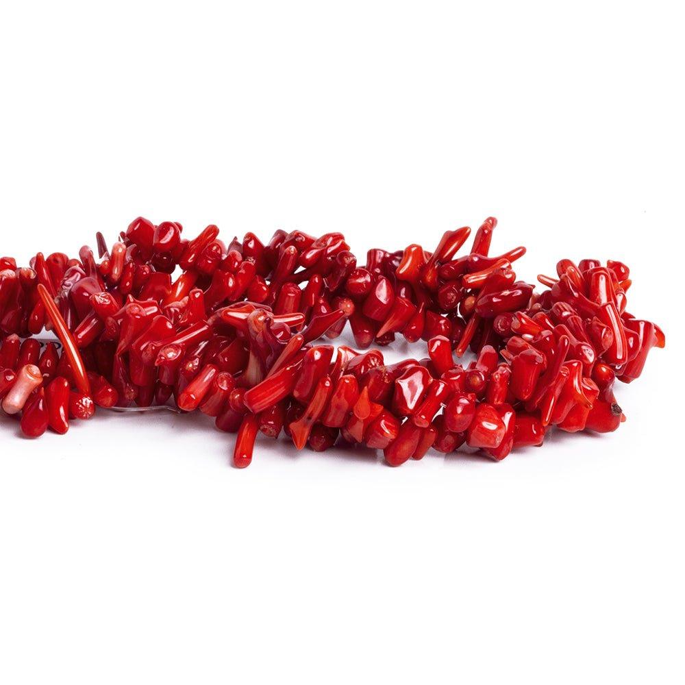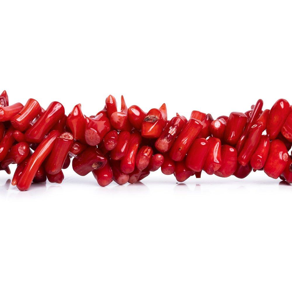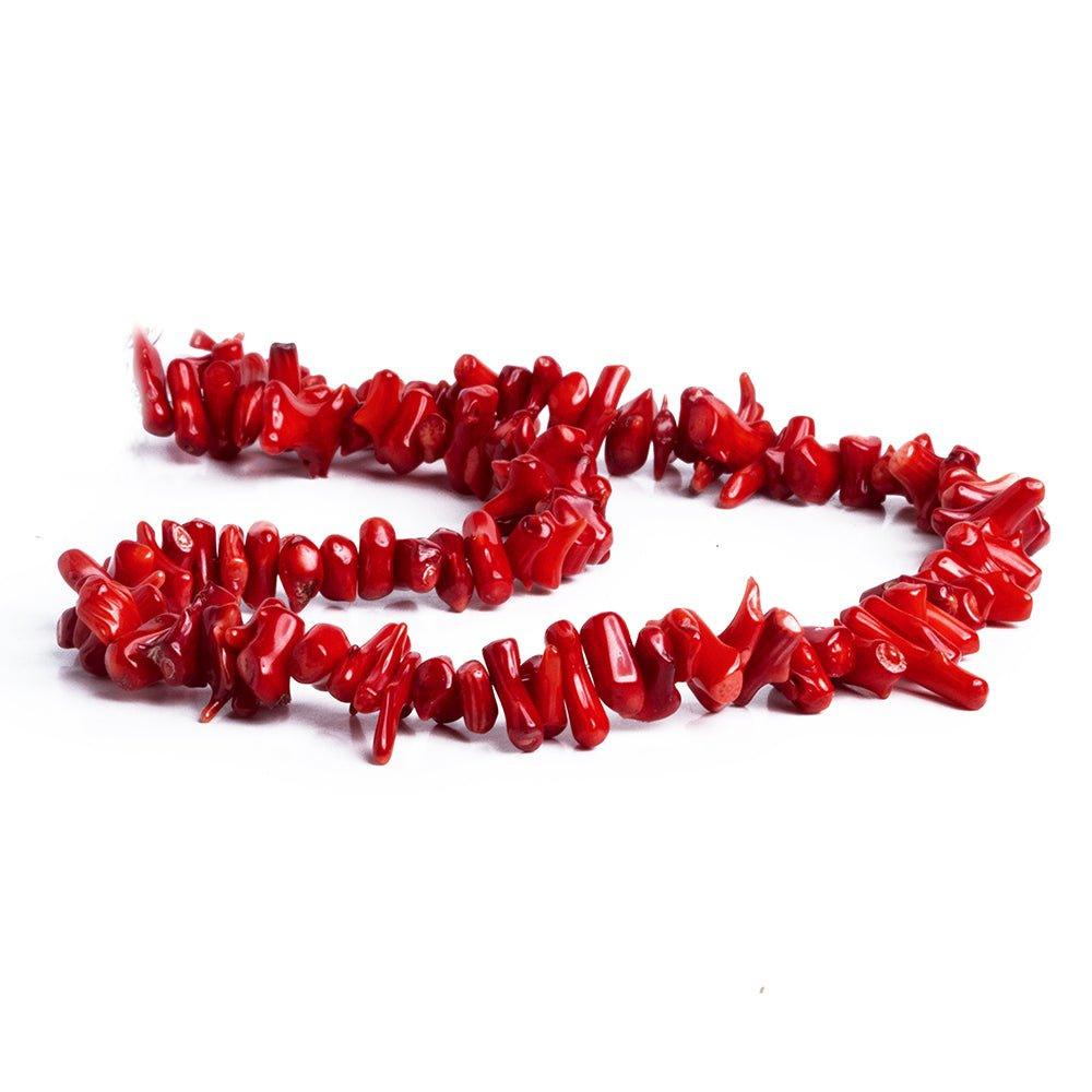 Beads average between 9x6mm and 15x7mm. These color enhanced Coral beads have an excellent bright red color and are matched on the strand for shape and size.