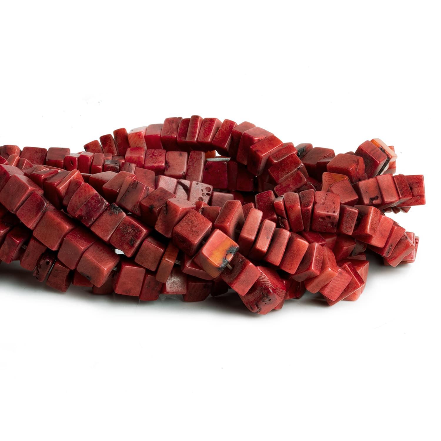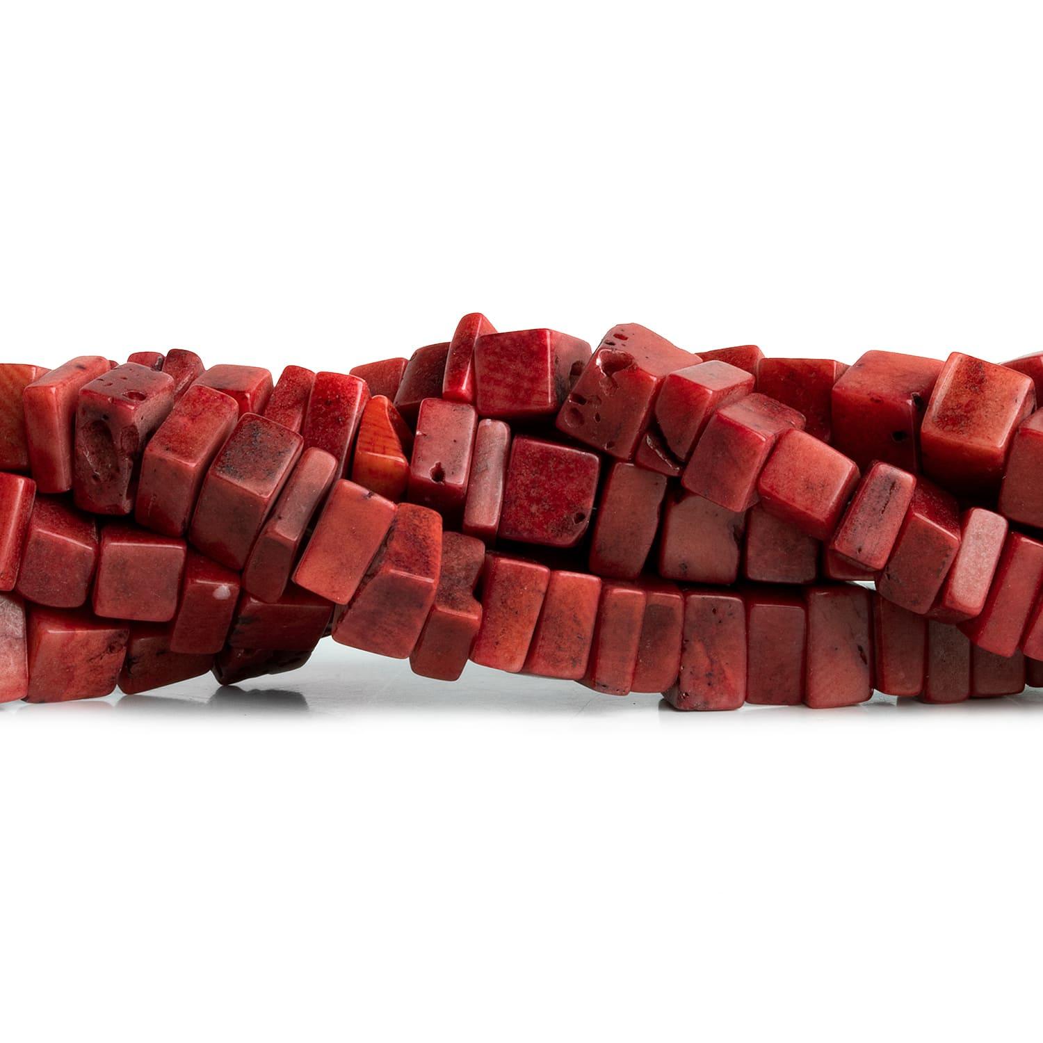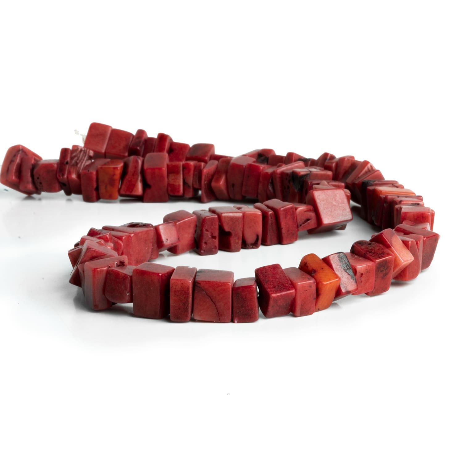 Beads average 8x3mm to 9x8mm. These rectangles are crafted from gorgeous red coral full of this material's unique textures. Expect a color palette that ranges from deep red to a burnt orange. Beads have a significant range in thickness with a highly consistent width. These lovely beads have been color enhanced.