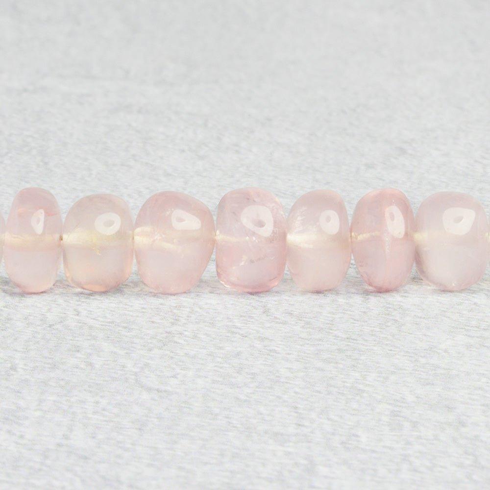 Beads average 8.5mm to 11mm in diameter. These lovely Rose Quartz rondelles have a milky clarity with a range of warm, pinkish tones and smooth polish. Expect variation in size, shape & color.