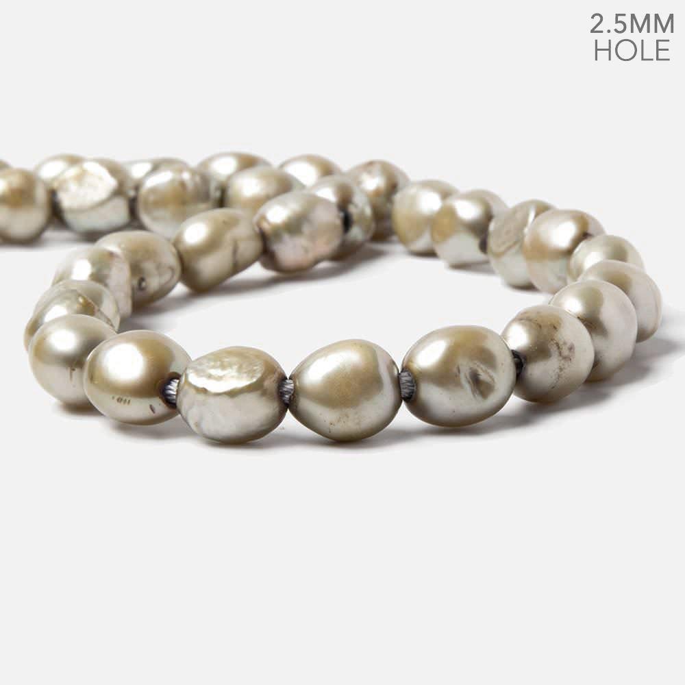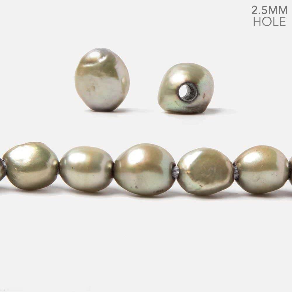 11x9mm to 13x9mm Sage Green Large Hole Freshwater Pearls exhibit a high luster with a consistent smooth nacre quality showing very slight irregularities on the asymmetrical baroque shaped bodies. These color treated 2.5mm drill hole freshwater pearls have been produced with a 5 step process to insure a clean and consistent diameter throughout each pearl. Pearl measurements are described as length by diameter.