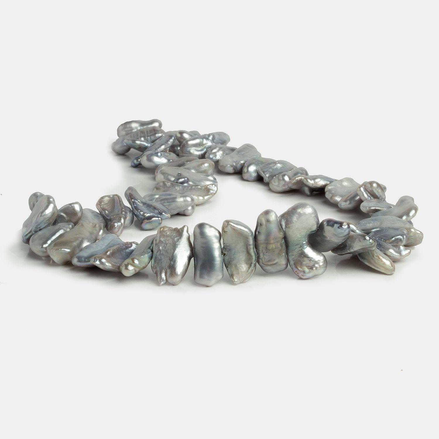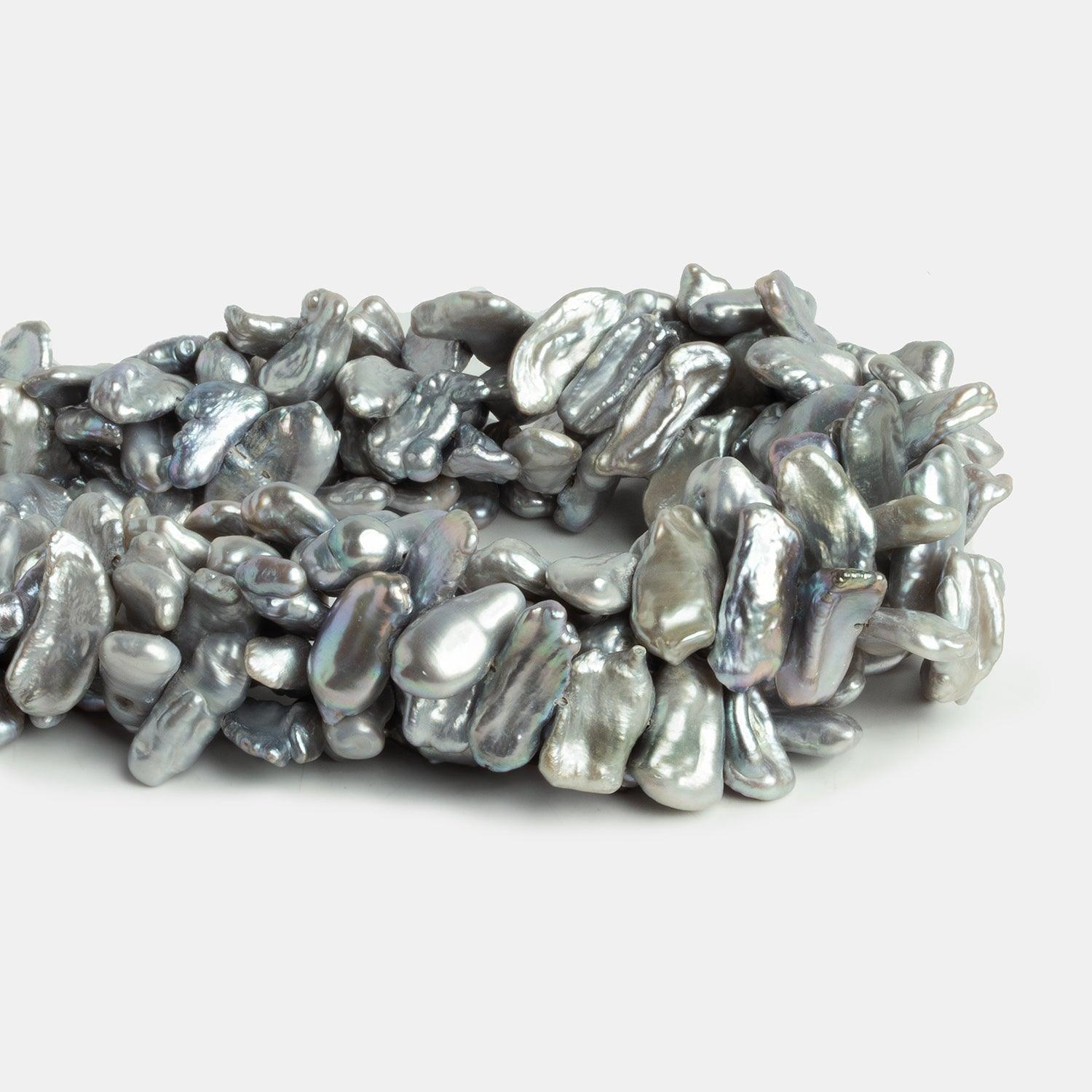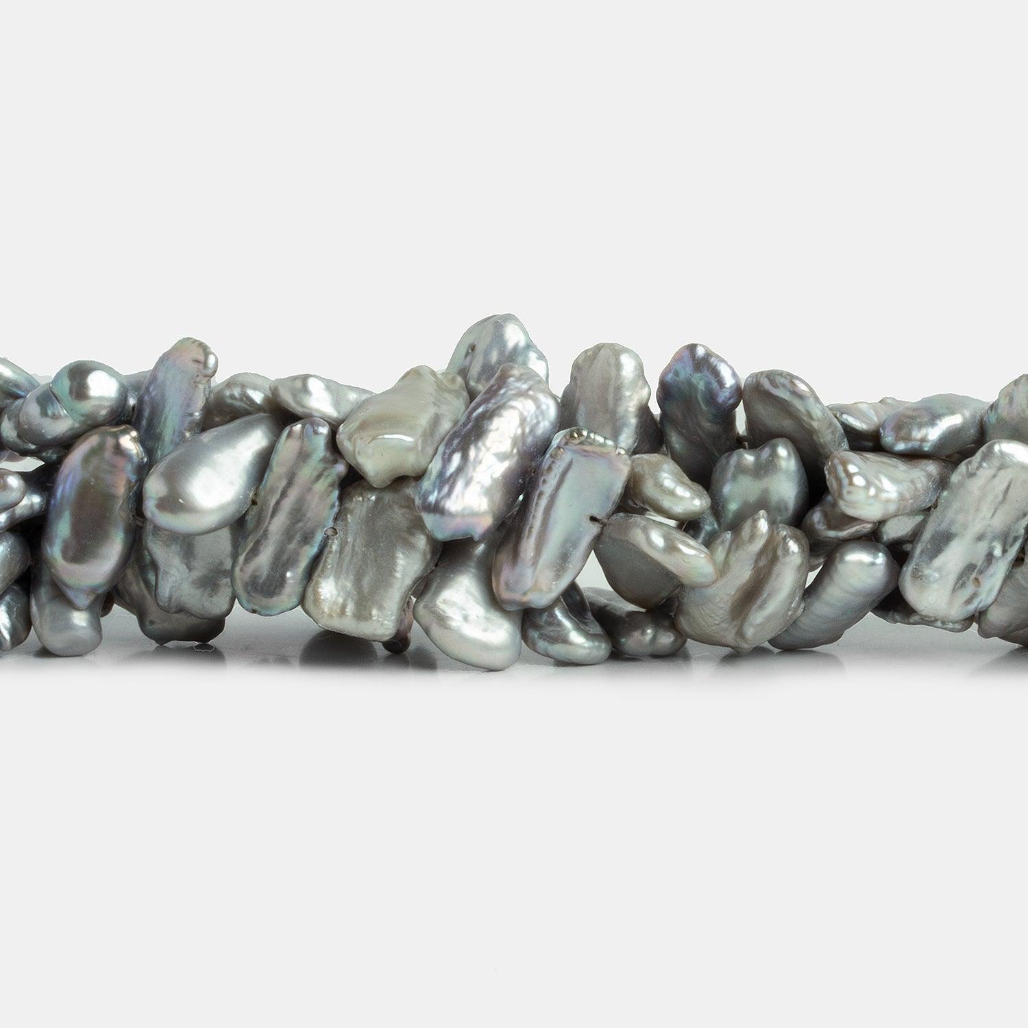 Pearls average about 17x10mm. Silver side drilled Biwa pearls have an excellent luster, stunning & consistent biwa shapes, and superb nacre quality. Expect a coloration that is primarily silver with some slightly cooler undertones.