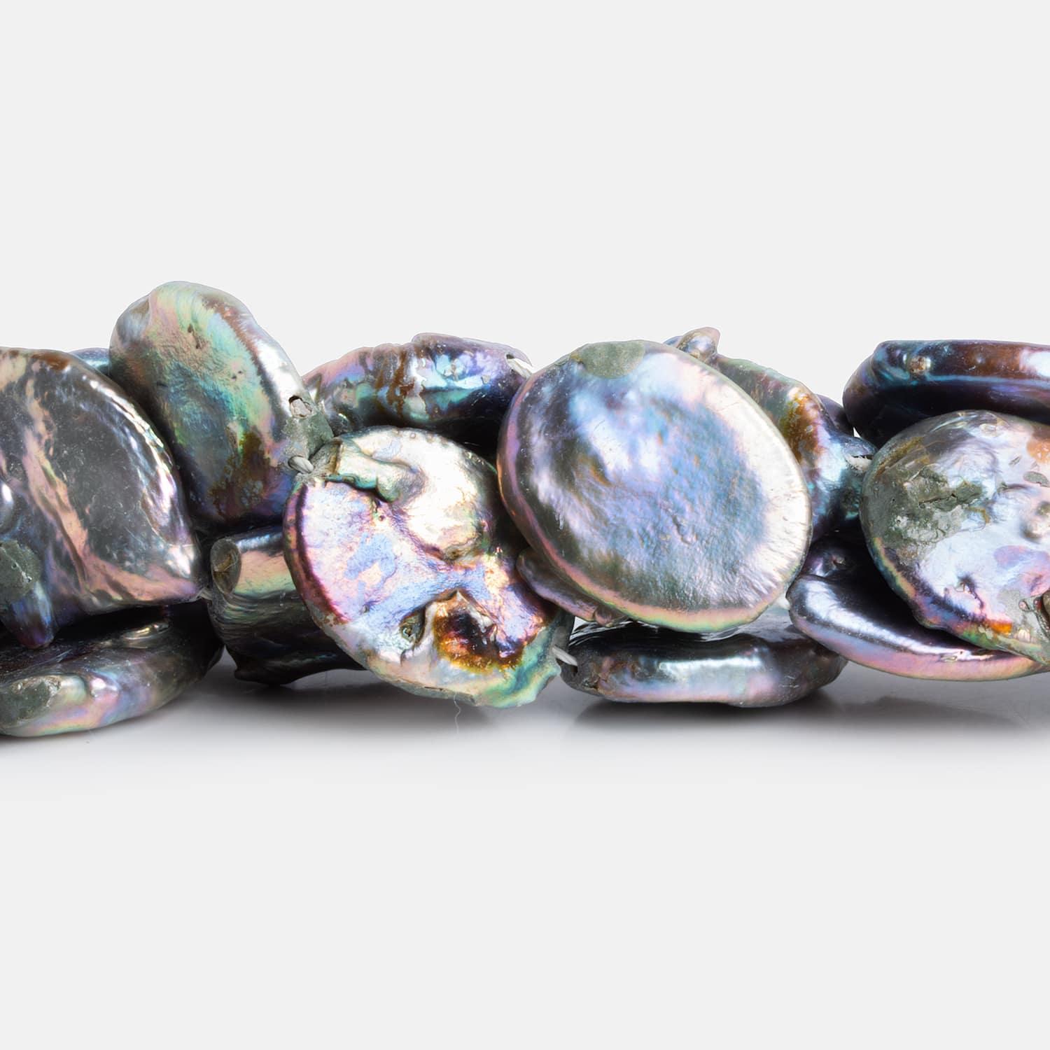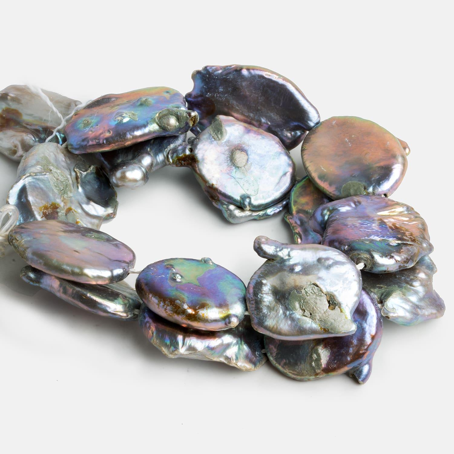 Pearls measure about 20x17mm to 28x22mm. These pearls show off a silvery peacock color palette with a range of peacock tones across broad, irregular coin-like bodies with a strong metallic luster. Expect sizable pearls strong in purples, reds greens and other undertones. Fans of eye-catching pearls should jump on these relatively thin pieces perfect for earrings, necklace focal beads and more.