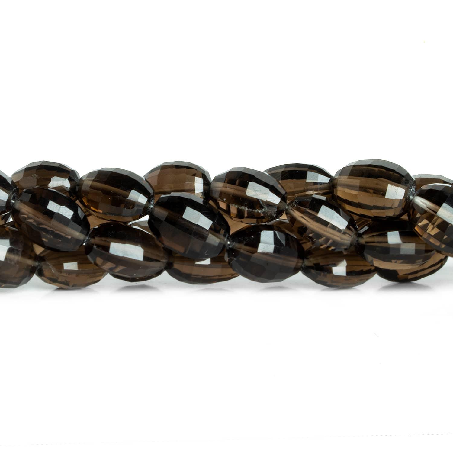 Beads average about 9x7mm to 12x9mm. These ovals showcase a checkerboard-style faceting on clear bodies practically free of internal characteristics. Enjoy a relatively dark, beige Smoky Quartz color palette.
