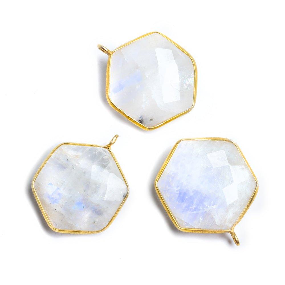 Rainbow Moonstone faceted hexagon Vermeil bezeled Connector measures approximately 20 mm. This Rainbow Moonstone shows a vitreous luster on the fairly symmetrical body exhibiting great multi-color flash on both sides of the Rainbow Moonstone gemstone which has moderate internal characteristics and offers a unique hexagon shape in a usable size with good make.