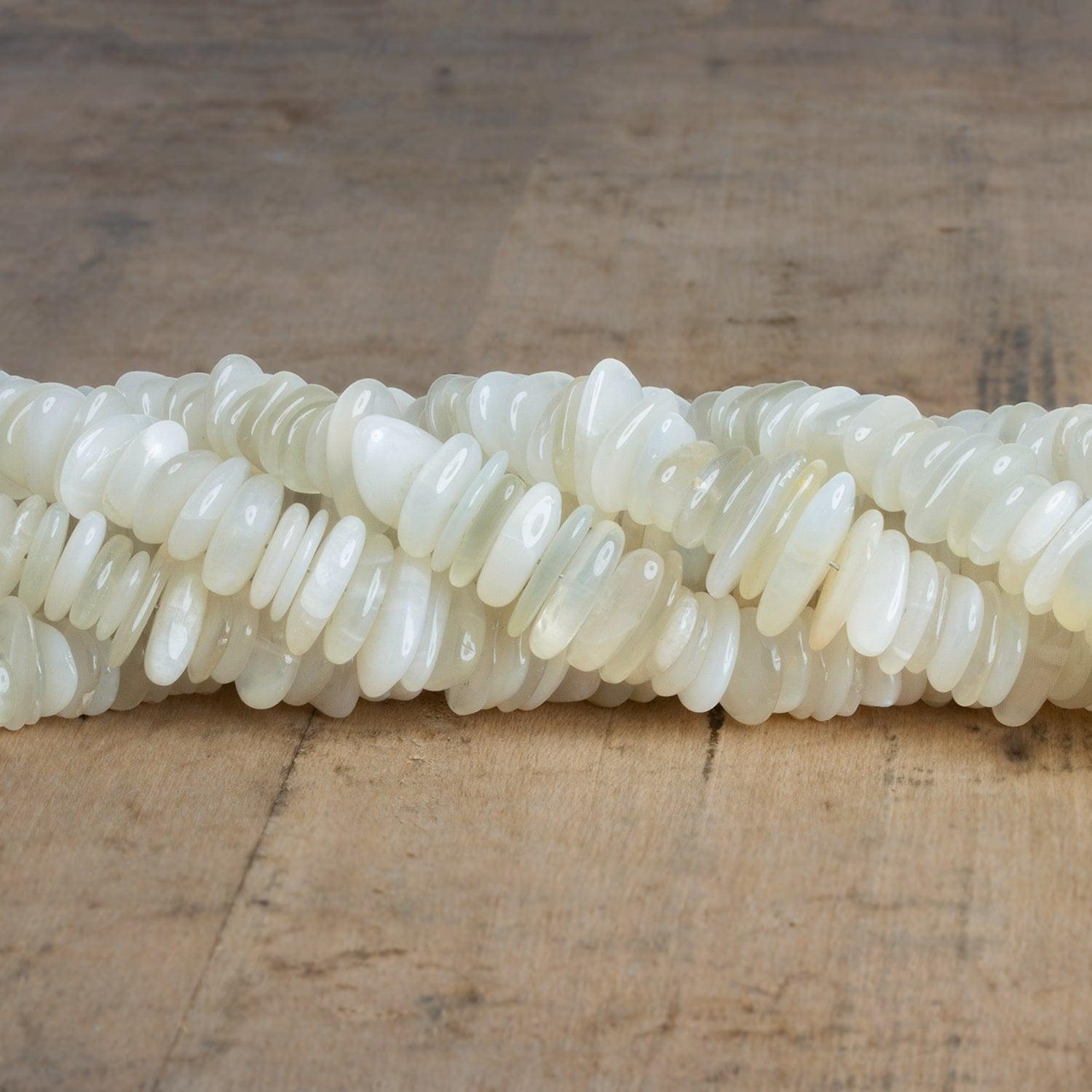 Beads average about 14x10mm. These sleek, smooth polished chip beads are graduated in size and showcase translucent to opaque white bodies filled with Moonstone's signature schiller.