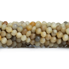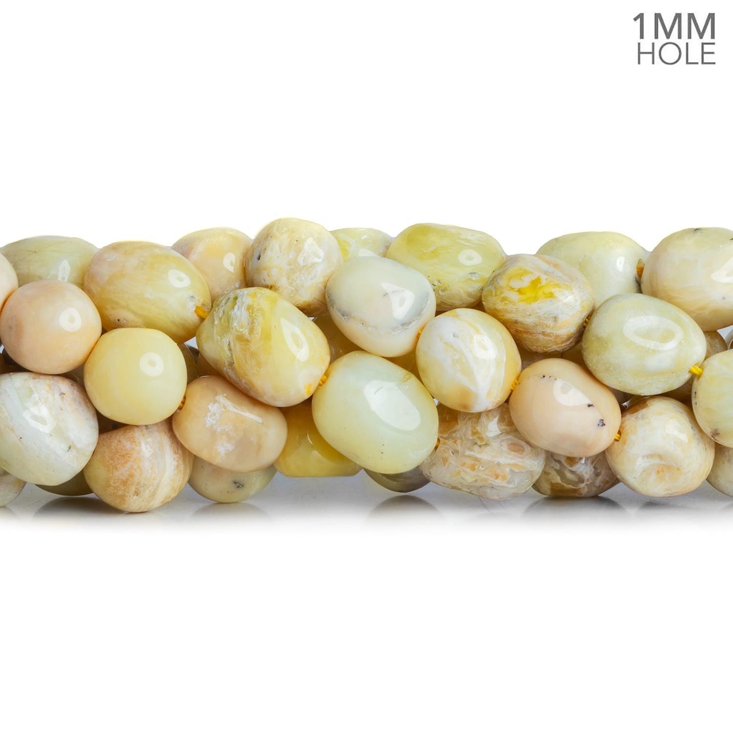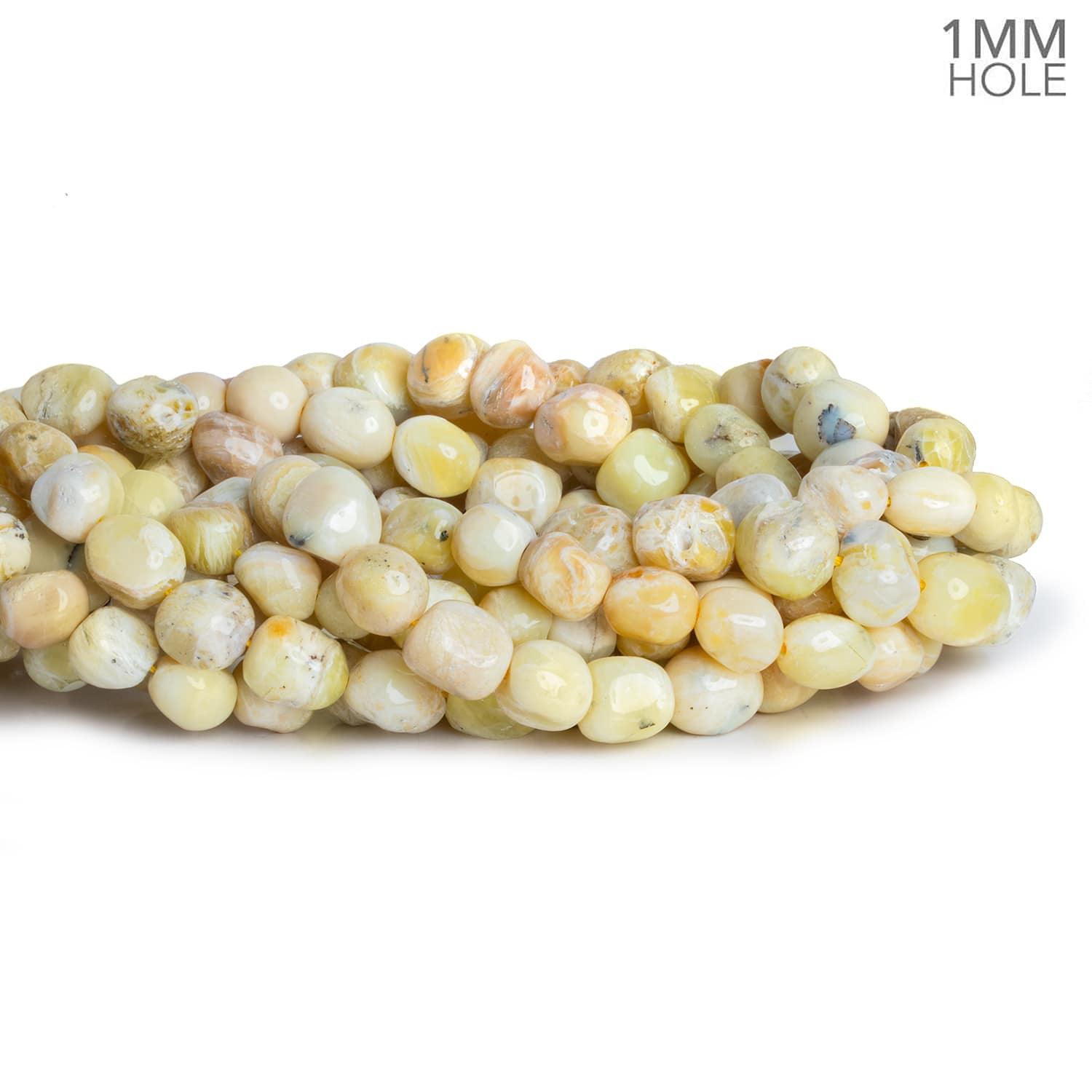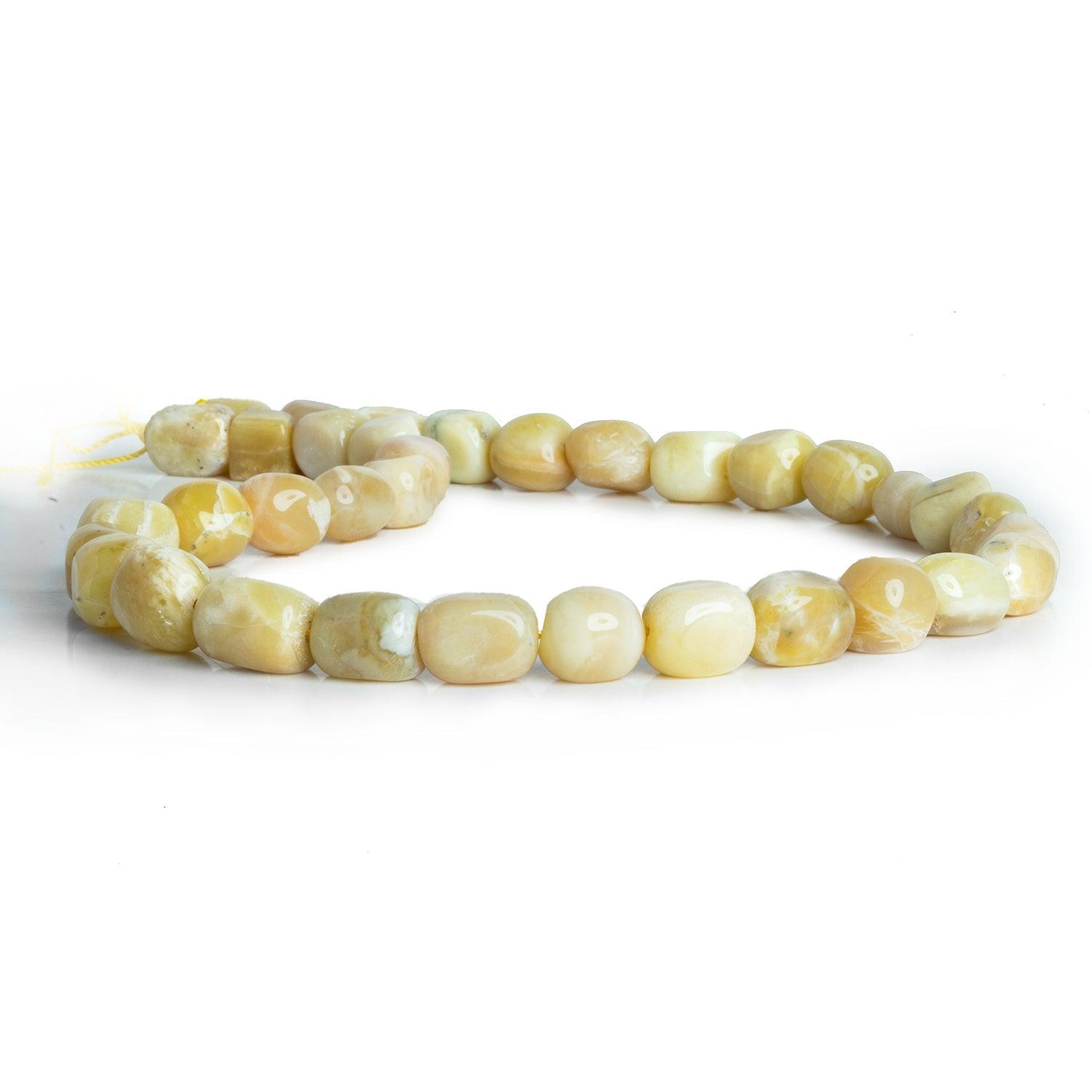 Beads range from about 8x8mm to 13x11mm. These nuggets tend toward a regular, rounded rectangle shape and show off a milky look dominated by a soft yellow hue. Expect some warm accenting tones as well as the swirling textures of yellow opal in these curated strands.